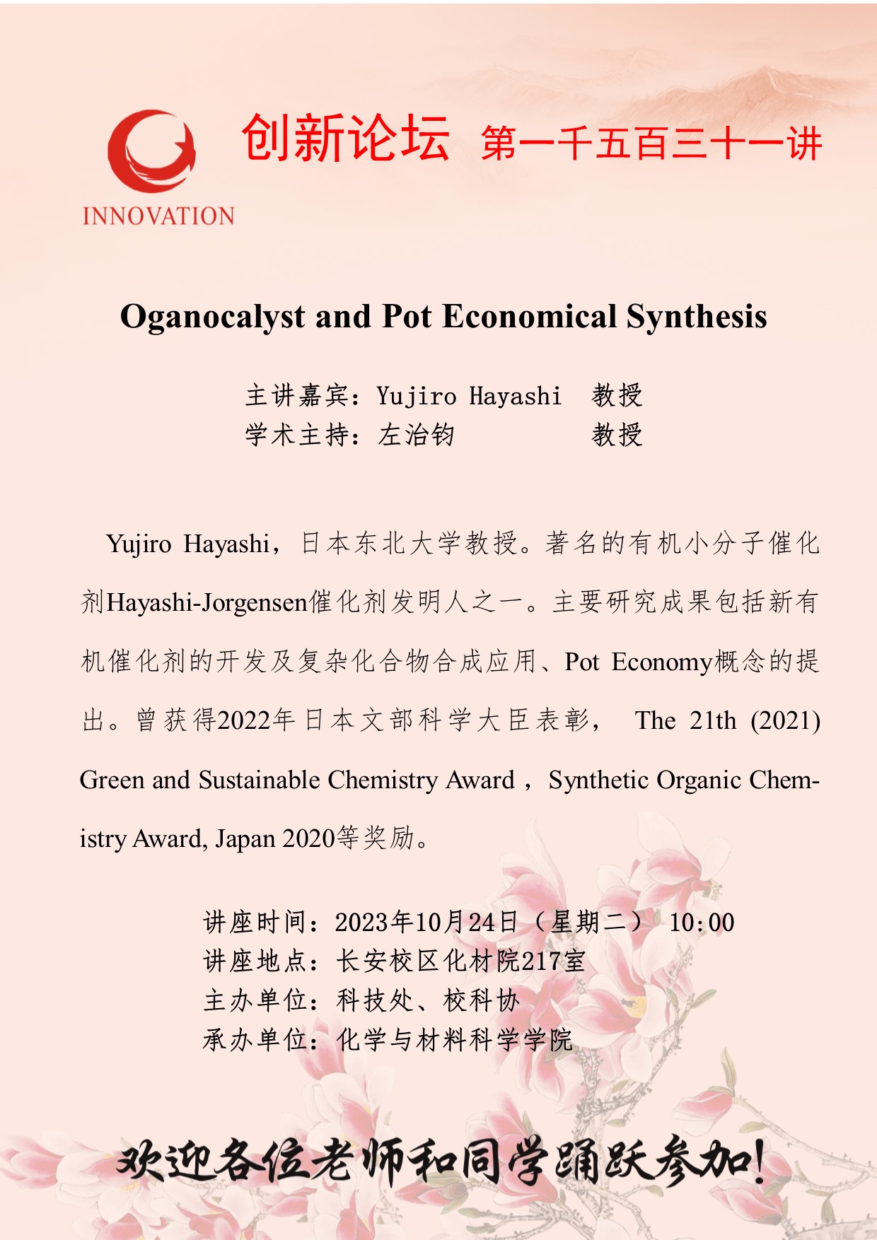 Yujiro Hayashi 教授 乐鱼网页版页面登录创新论坛第一千五百三十一讲:Oganocalyst and Pot Economical Synthesis 讲座时间 2023年10月24日(星期二) 10:00 讲座地点 长安校区化材院217室 讲座人介绍 Yujiro Hayashi 教授 讲座内容