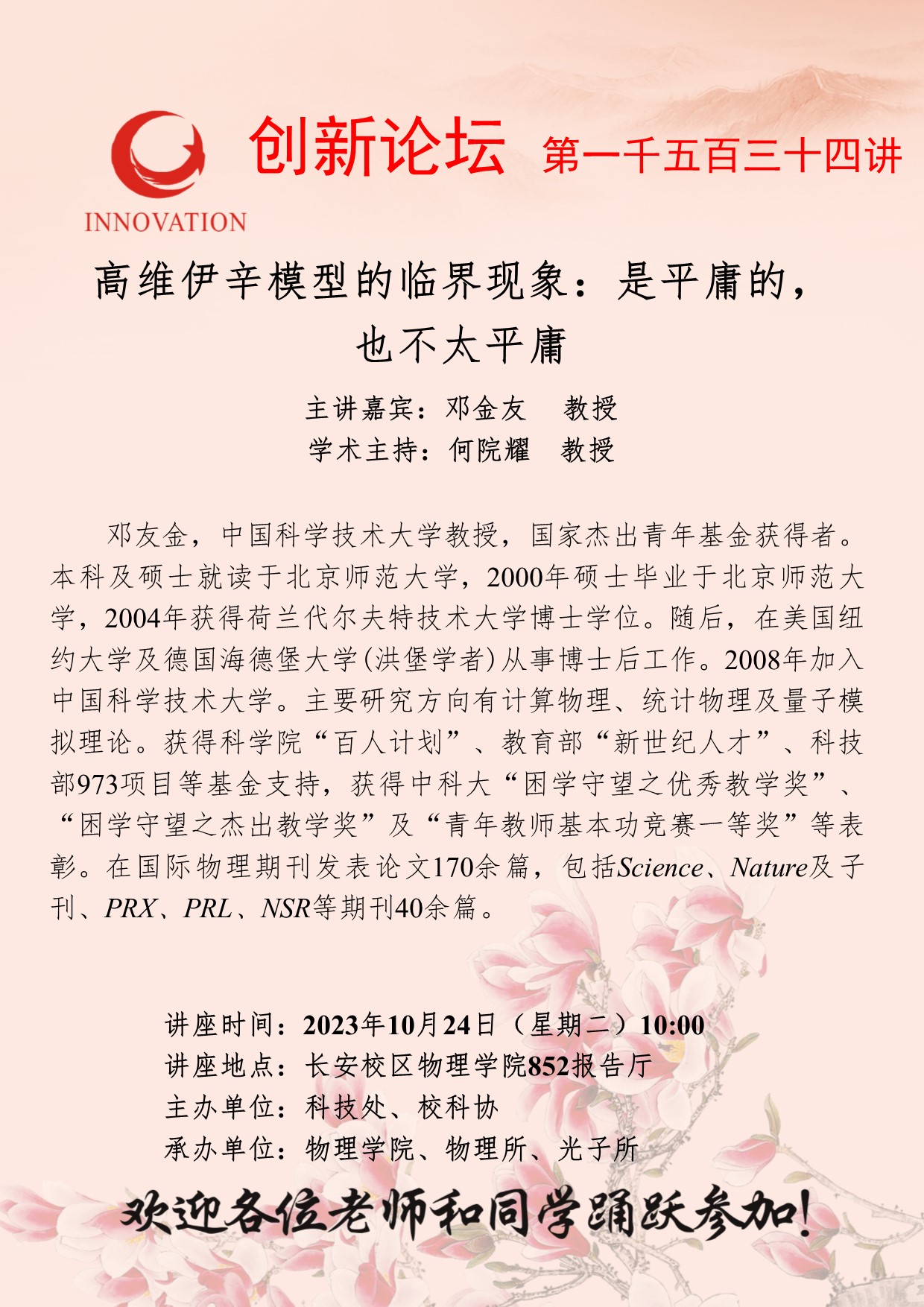 邓金友 教授 乐鱼网页版页面登录创新论坛第一千五百三十四讲:高维伊辛模型的临界现象:是平庸的, 也不太平庸 讲座时间 2023年10月24日(星期二)10:00 讲座地点 长安校区物理学院852报告厅 讲座人介绍 邓金友 教授 讲座内容