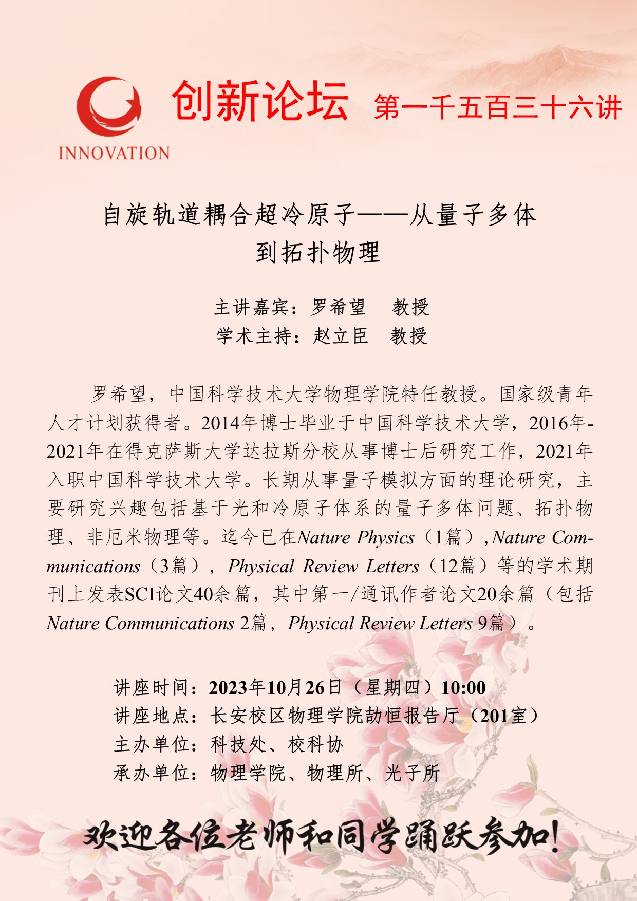 罗希望 教授 乐鱼网页版页面登录创新论坛第一千五百三十六讲:自旋轨道耦合超冷原子——从量子多体到拓扑物理 讲座时间 2023年10月26日(星期四)10:00 讲座地点 长安校区物理学院劼恒报告厅(201室) 讲座人介绍 罗希望 教授 讲座内容