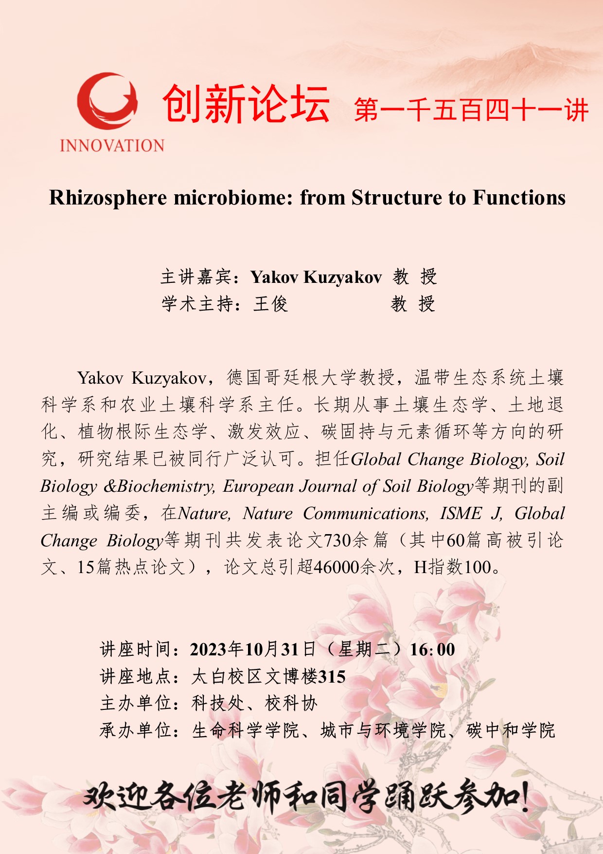 Yakov Kuzyakov 教 授 乐鱼网页版页面登录创新论坛第一千五百四十一讲:Rhizosphere microbiome: from Structure to Functions 讲座时间 2023年10月31日(星期二)16:00 讲座地点 太白校区文博楼315 讲座人介绍 Yakov Kuzyakov 教 授 讲座内容