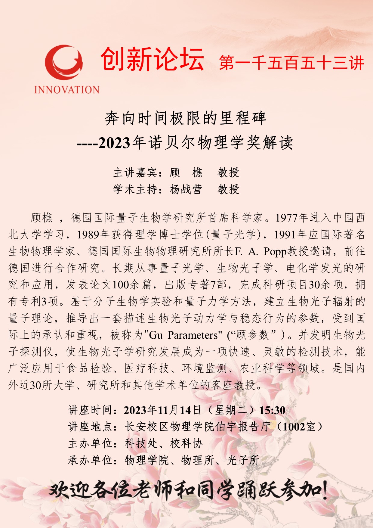 顾樵 教授 乐鱼网页版页面登录创新论坛第一千五百五十三讲:奔向时间极限的里程碑----2023年诺贝尔物理学奖解读 讲座时间 2023年11月14日(星期二)15:30 讲座地点 长安校区物理学院伯宇报告厅(1002室) 讲座人介绍 顾樵 教授 讲座内容