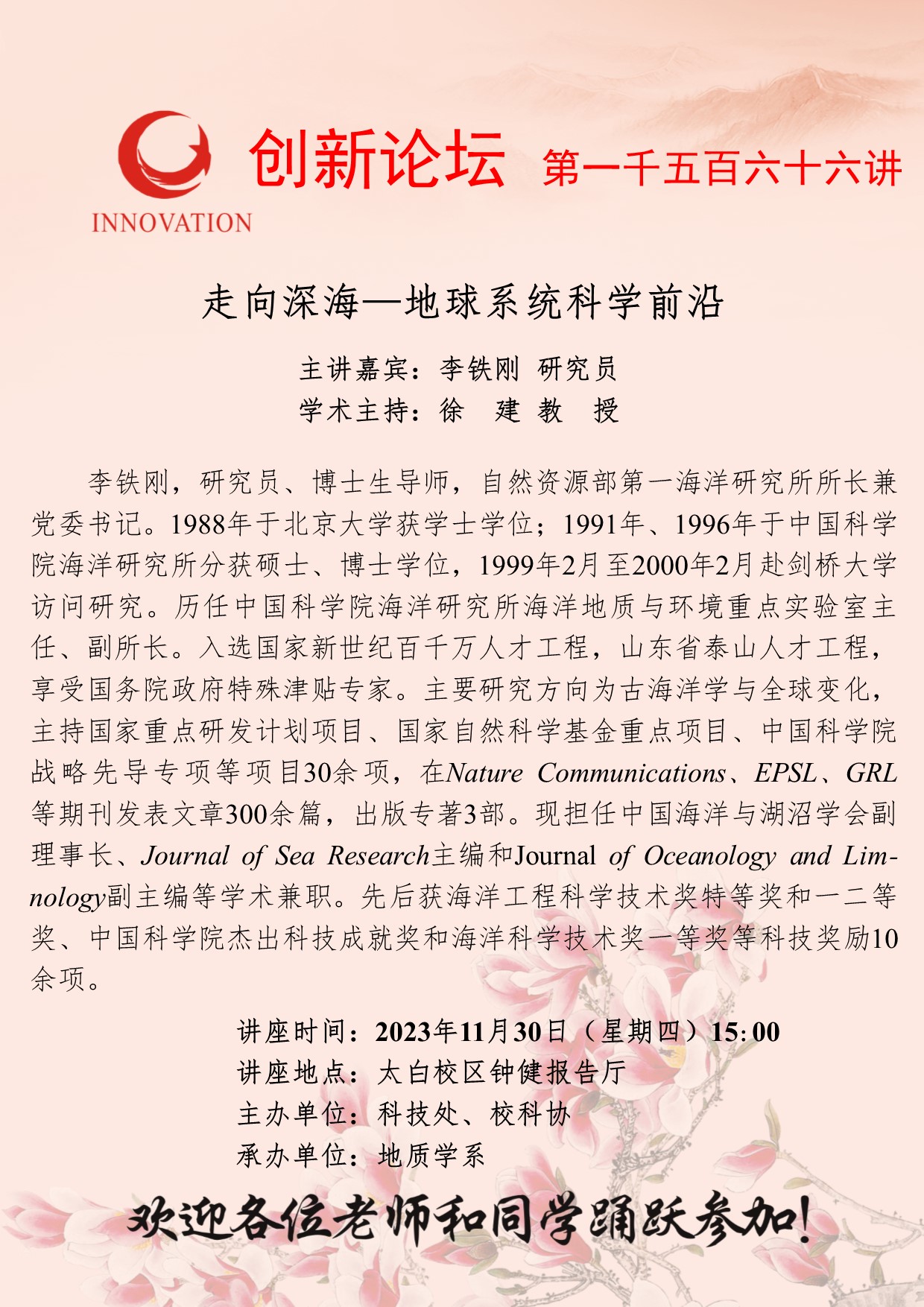 李铁刚 研究员 乐鱼网页版页面登录创新论坛第一千五百六十六讲:走向深海—地球系统科学前沿 讲座时间 2023年11月30日(星期四)15:00 讲座地点 太白校区钟健报告厅 讲座人介绍 李铁刚 研究员 讲座内容