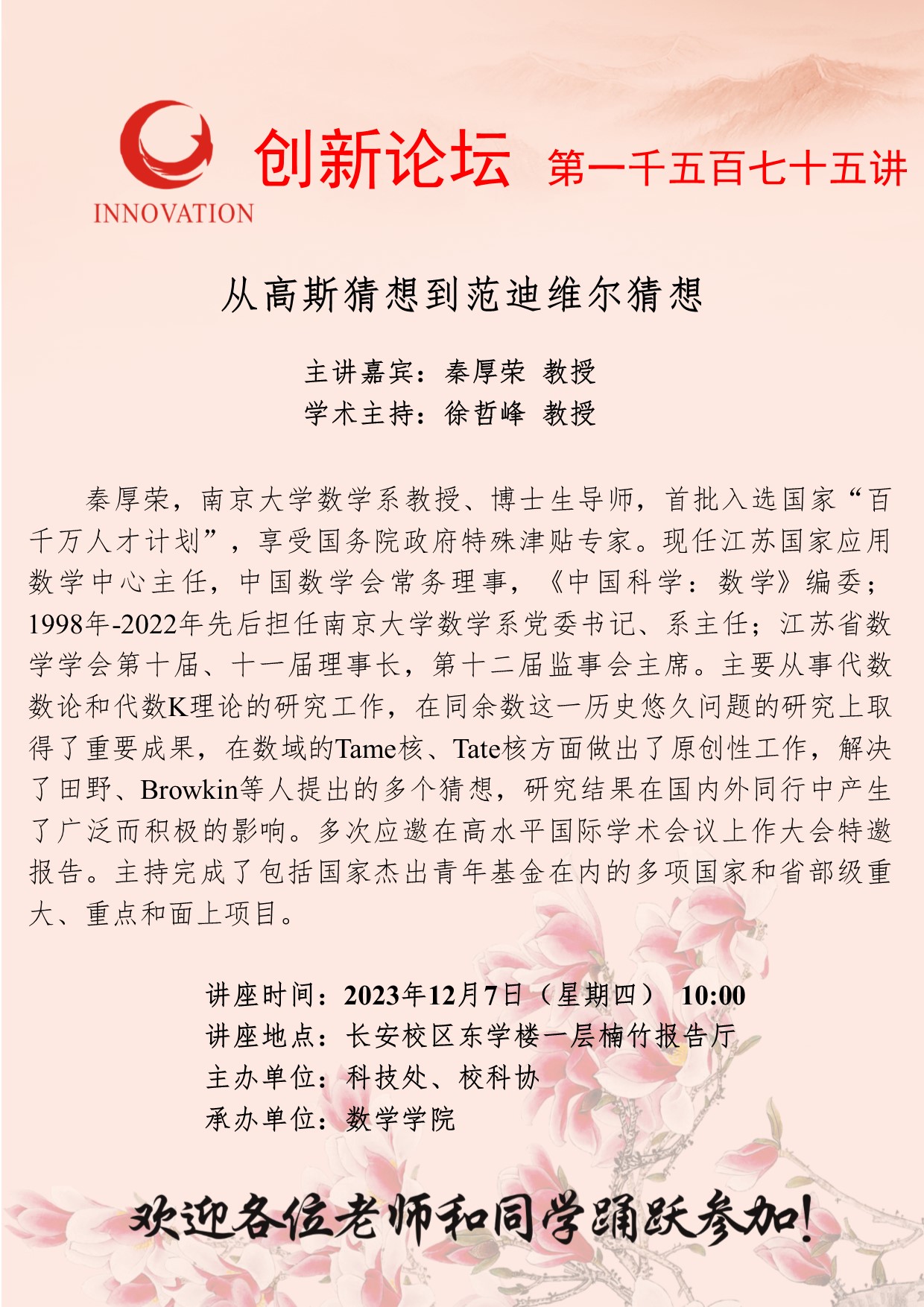 秦厚荣 教授 乐鱼网页版页面登录创新论坛第一千五百七十五讲:从高斯猜想到范迪维尔猜想 讲座时间 2023年12月7日(星期四) 10:00 讲座地点 长安校区东学楼一层楠竹报告厅 讲座人介绍 秦厚荣 教授 讲座内容