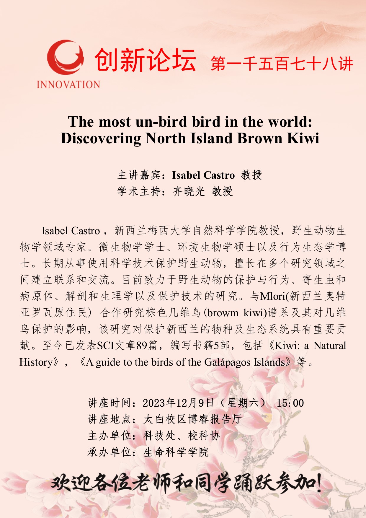 Isabel Castro 教授 乐鱼网页版页面登录创新论坛第一千五百七十八讲:The most un-bird bird in the world: Discovering North Island Brown Kiwi 讲座时间 2023年12月9日(星期六) 15:00 讲座地点 太白校区博睿报告厅 讲座人介绍 Isabel Castro 教授 讲座内容