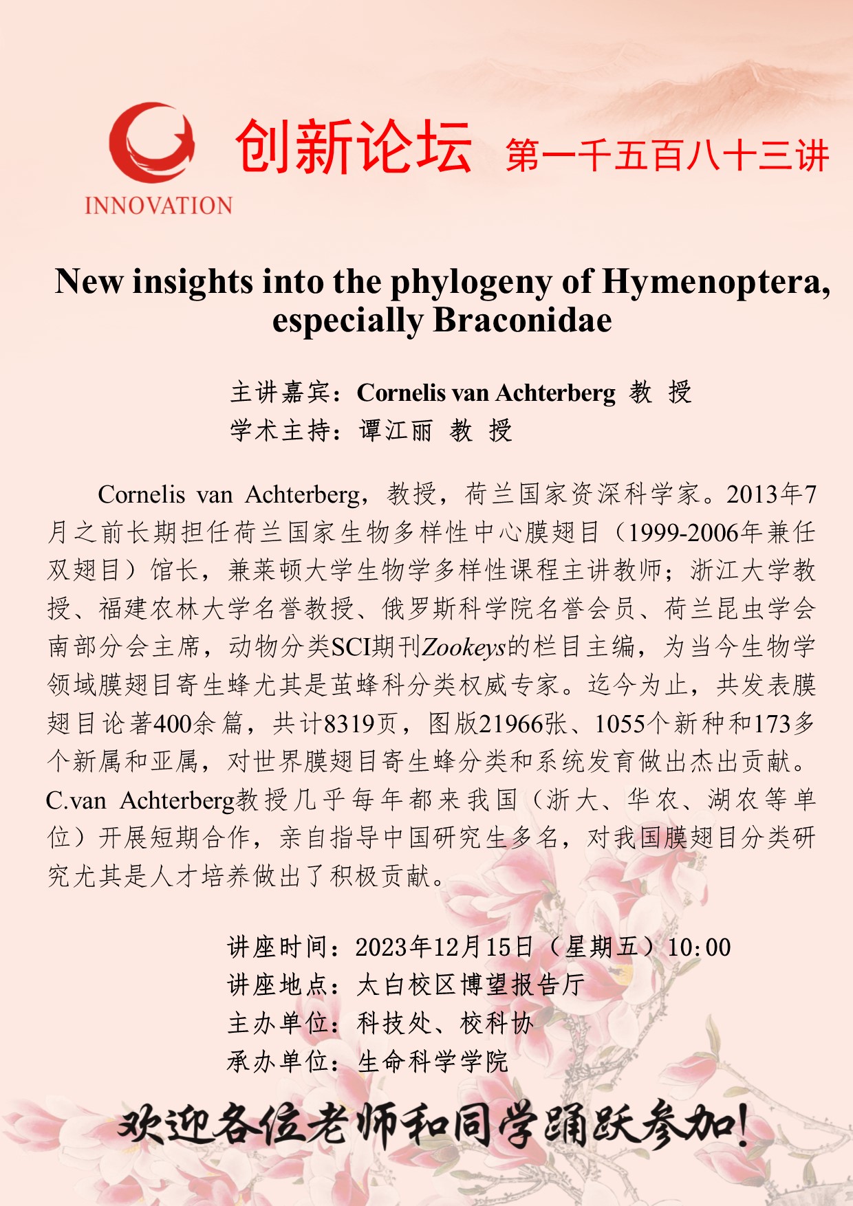 Cornelis van Achterberg 教 授 乐鱼网页版页面登录创新论坛第一千五百八十三讲:New insights into the phylogeny of Hymenoptera, especially Braconidae 讲座时间 2023年12月15日(星期五)10:00 讲座地点 太白校区博望报告厅 讲座人介绍 Cornelis van Achterberg 教 授 讲座内容