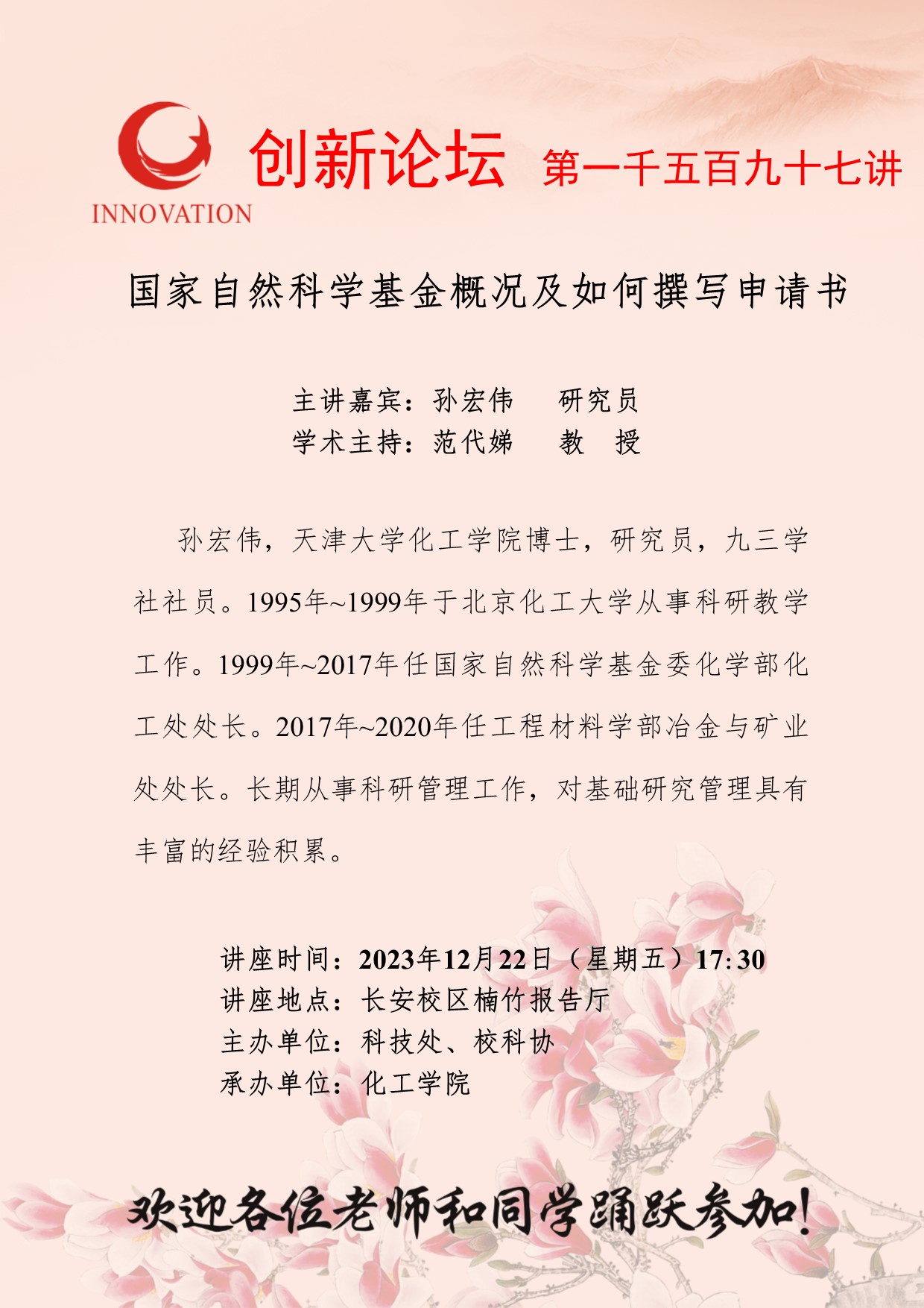 孙宏伟 研究员 乐鱼网页版页面登录创新论坛第一千五百九十七讲:国家自然科学基金概况及如何撰写申请书 讲座时间 2023年12月22日(星期五)17:30 讲座地点 长安校区楠竹报告厅 讲座人介绍 孙宏伟 研究员 讲座内容