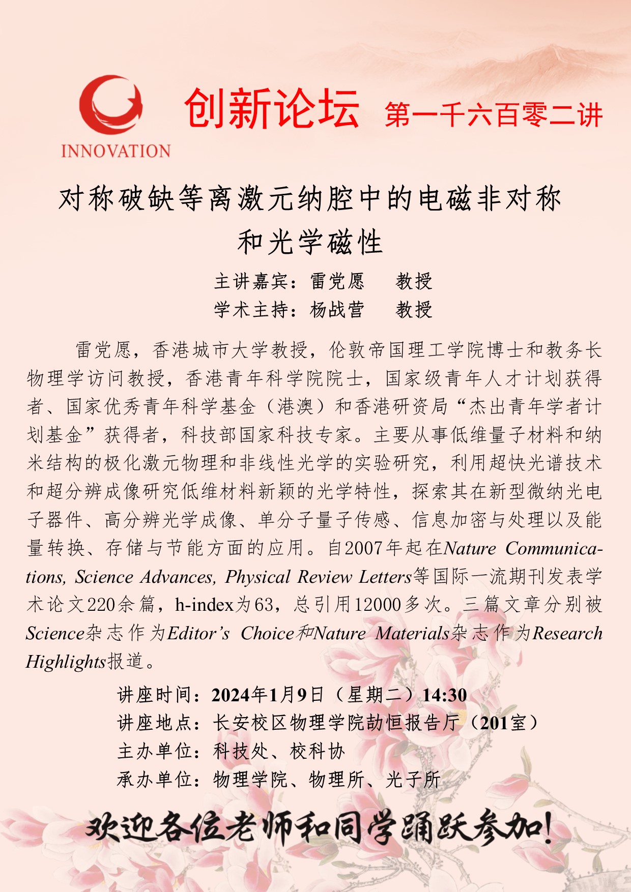 雷党愿 教授 乐鱼网页版页面登录创新论坛第一千六百零二讲:对称破缺等离激元纳腔中的电磁非对称和光学磁性 讲座时间 2024年1月9日(星期二)14:30 讲座地点 长安校区物理学院劼恒报告厅(201室 讲座人介绍 雷党愿 教授 讲座内容