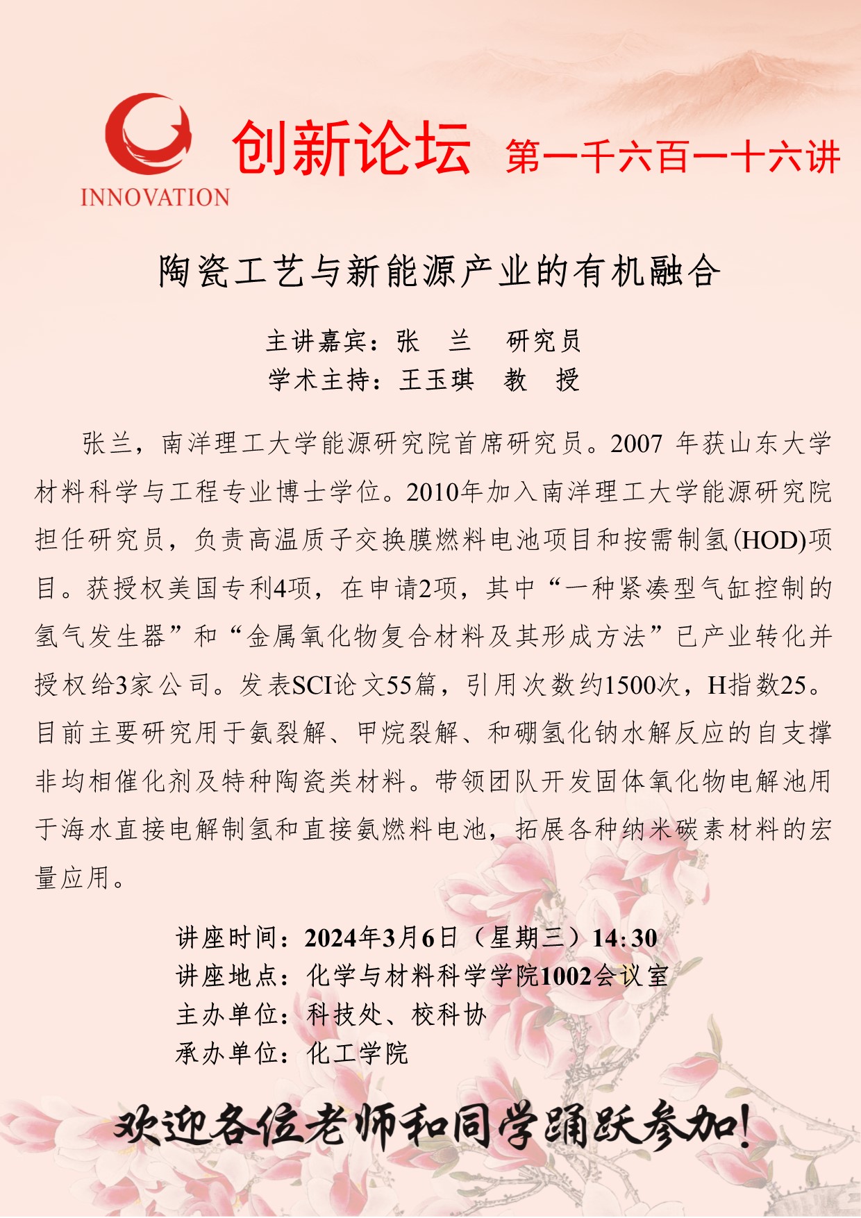 张兰 研究员 乐鱼网页版页面登录创新论坛第一千六百一十六讲:陶瓷工艺与新能源产业的有机融合 讲座时间 2024年3月6日(星期三)14:30 讲座地点 化学与材料科学学院1002会议室 讲座人介绍 张兰 研究员 讲座内容