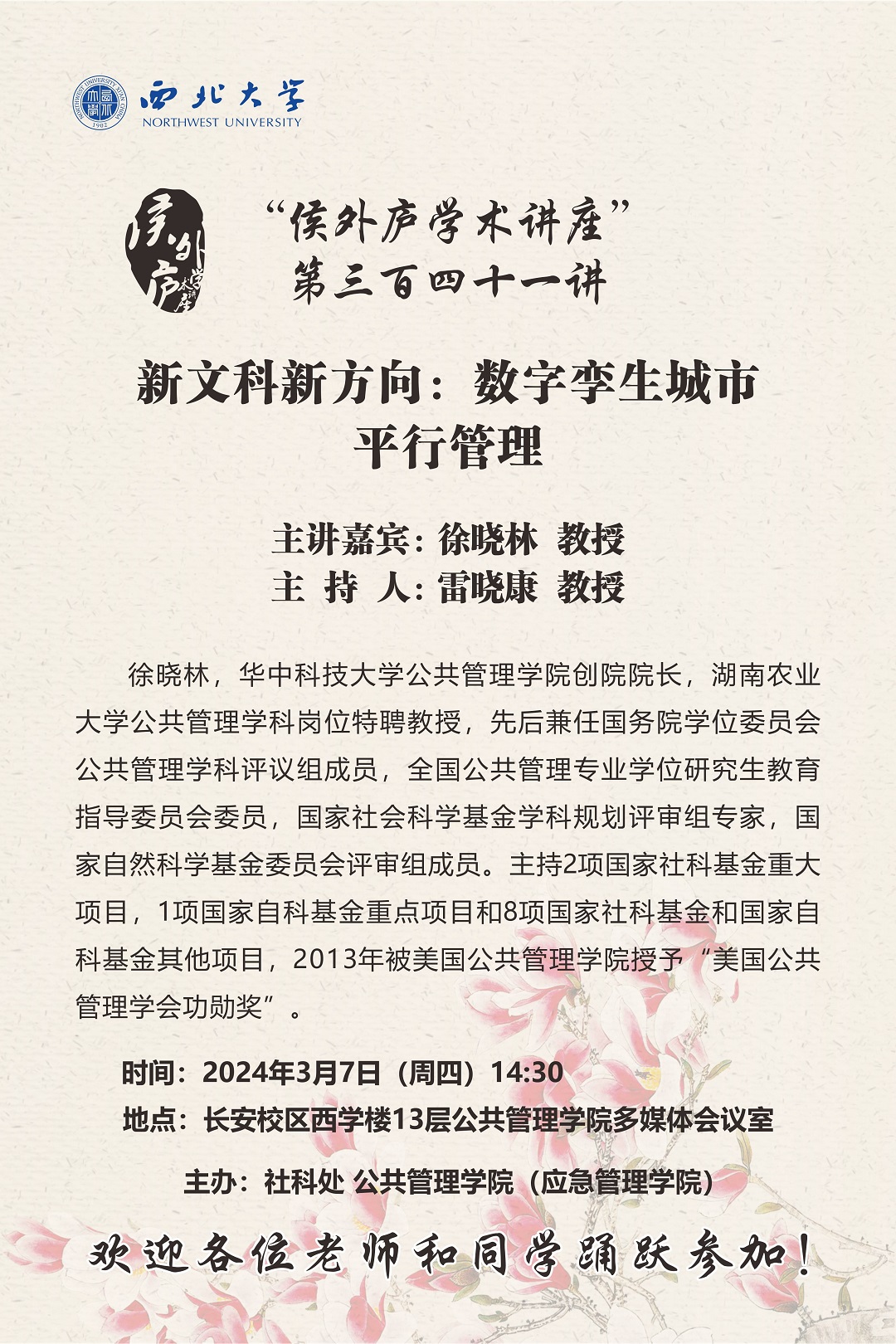 徐晓林 教授 侯外庐学术讲座第三百四十一讲:新文科新方向:数字孪生城市平行管理 讲座时间 2024年3月7日(周四)14:30 讲座地点 长安校区西学楼13层公共管理学院多媒体会议室 讲座人介绍 徐晓林 教授 讲座内容