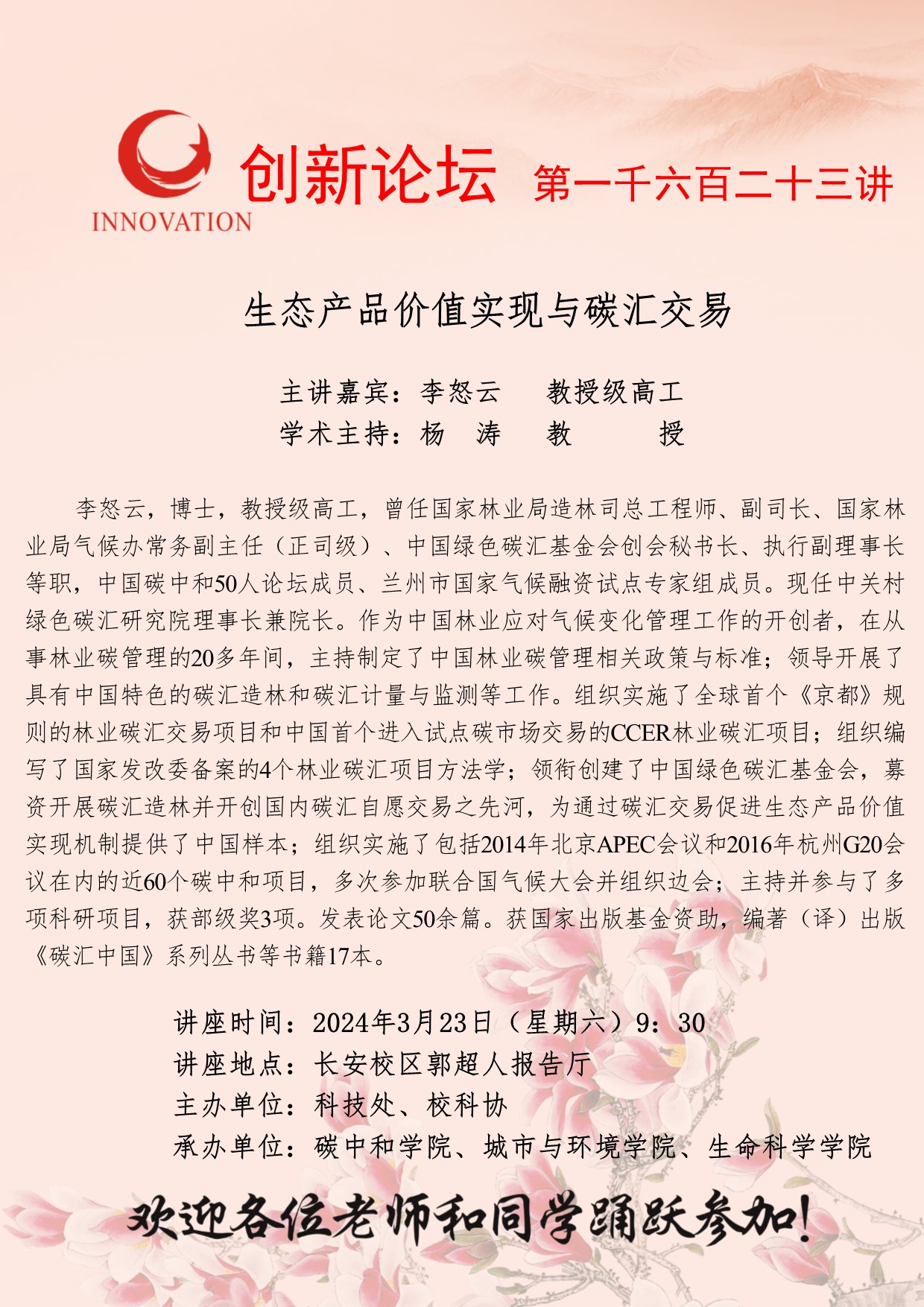 李怒云 教授级高工 乐鱼网页版页面登录创新论坛第一千六百二十三讲:生态产品价值实现与碳汇交易 讲座时间 2024年3月23日(星期六)9:30 讲座地点 长安校区郭超人报告厅 讲座人介绍 李怒云 教授级高工 讲座内容