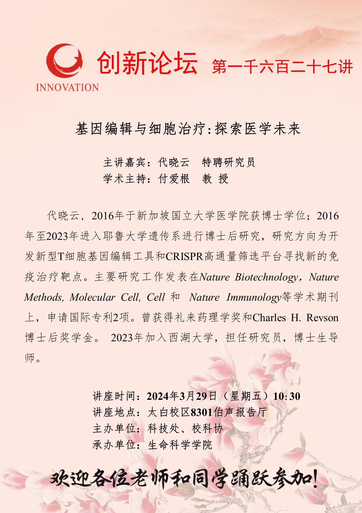 代晓云 特聘研究员 乐鱼网页版页面登录创新论坛第一千六百二十七讲:基因编辑与细胞治疗:探索医学未来 讲座时间 2024年3月29日(星期五)10:30 讲座地点 太白校区8301伯声报告厅 讲座人介绍 代晓云 特聘研究员 讲座内容