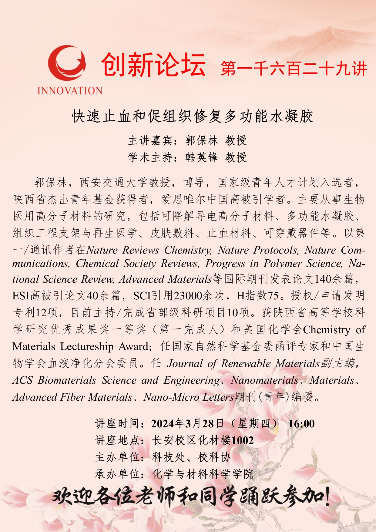 郭保林 教授 乐鱼网页版页面登录创新论坛第一千六百二十九讲:快速止血和促组织修复多功能水凝胶 讲座时间 2024年3月28日(星期四) 16:00 讲座地点 长安校区化材楼1002 讲座人介绍 郭保林 教授 讲座内容