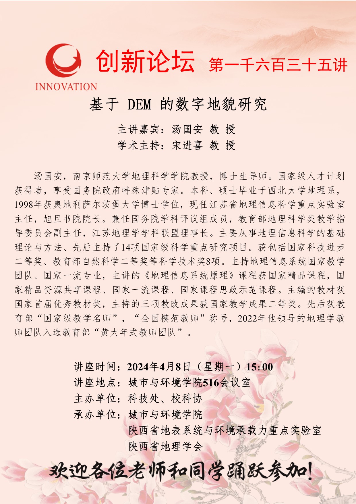 汤国安 教授 乐鱼网页版页面登录创新论坛第一千六百三十五讲:基于 DEM 的数字地貌研究 讲座时间 2024年4月8日(星期一)15:00 讲座地点 城市与环境学院516会议室 讲座人介绍 汤国安 教授 讲座内容