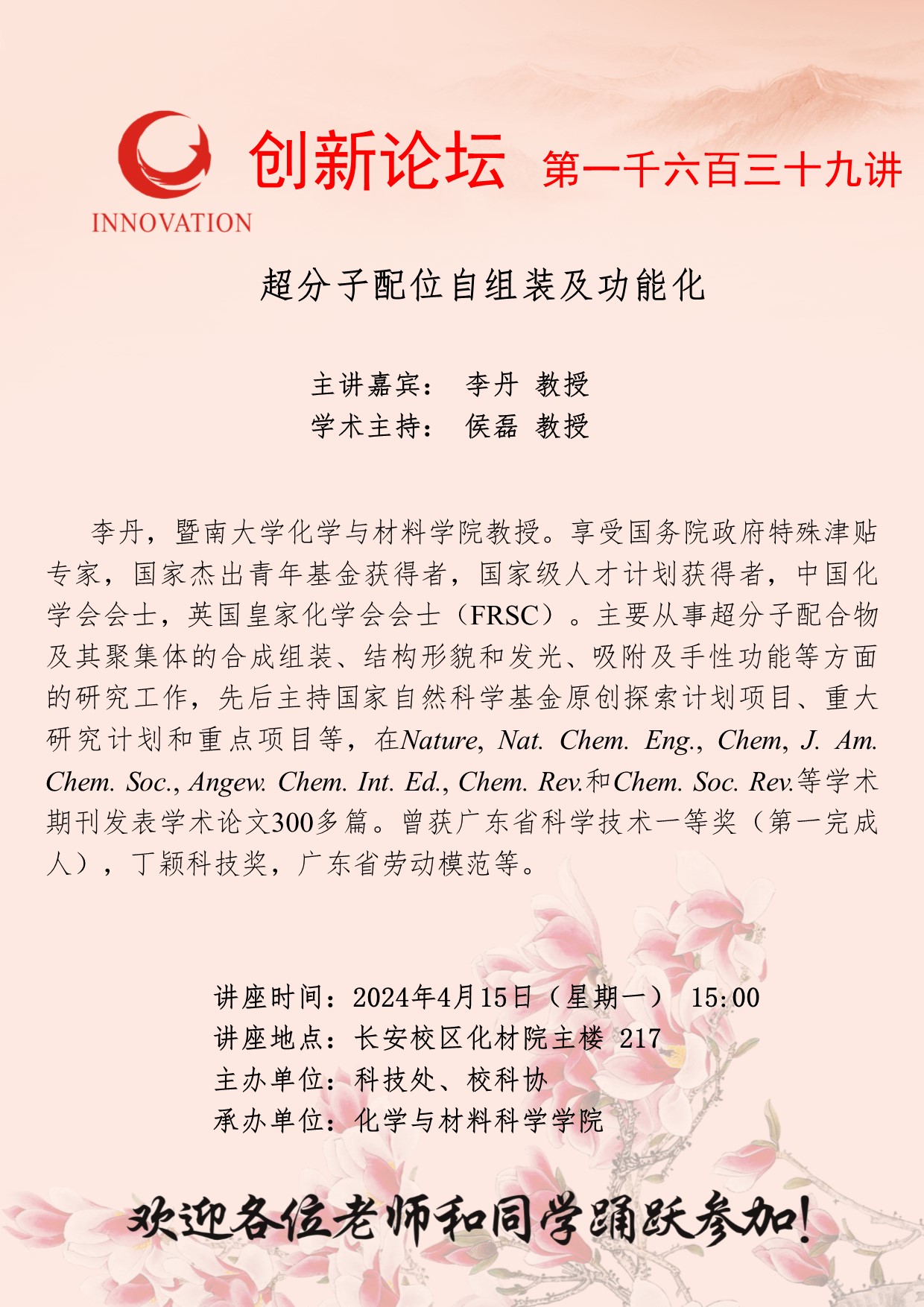 李丹 教授 乐鱼网页版页面登录创新论坛第一千六百三十九讲:超分子配位自组装及功能化 讲座时间 2024年4月15日(星期一) 15:00 讲座地点 长安校区化材院主楼 217 讲座人介绍 李丹 教授 讲座内容