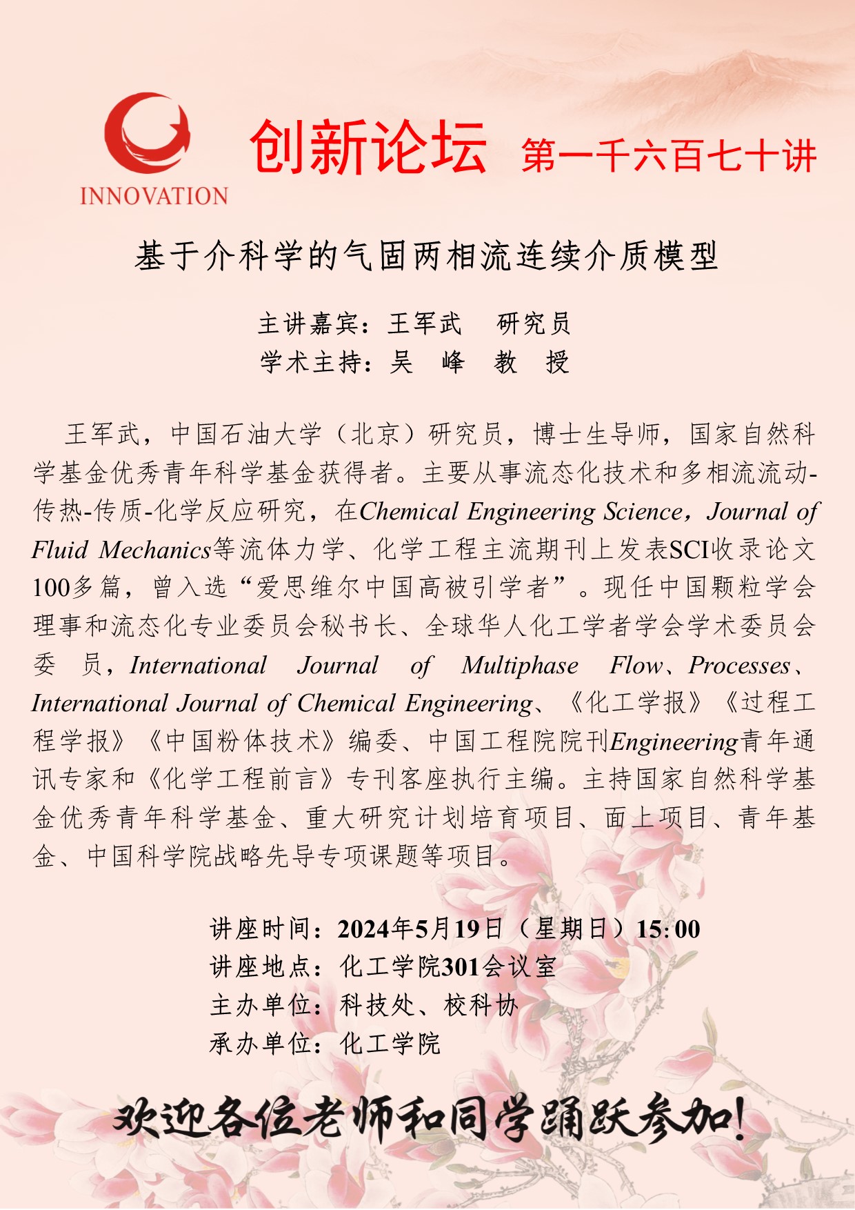 王军武 研究员 乐鱼网页版页面登录创新论坛第一千六百七十讲:基于介科学的气固两相流连续介质模型 讲座时间 2024年5月19日(星期日)15:00 讲座地点 化工学院301会议室 讲座人介绍 王军武 研究员 讲座内容