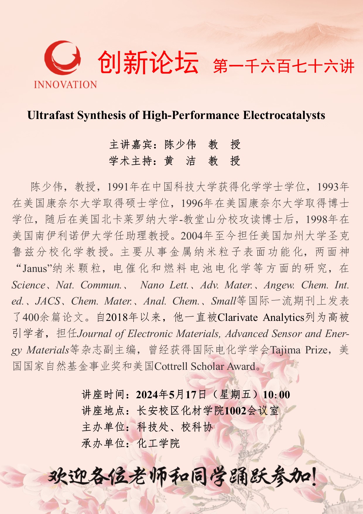 陈少伟 教授 乐鱼网页版页面登录创新论坛第一千六百七十七讲:Ultrafast Synthesis of High-Performance Electrocatalysts 讲座时间 2024年5月17日(星期五)10:00 讲座地点 长安校区化材学院1002会议室 讲座人介绍 陈少伟 教授 讲座内容