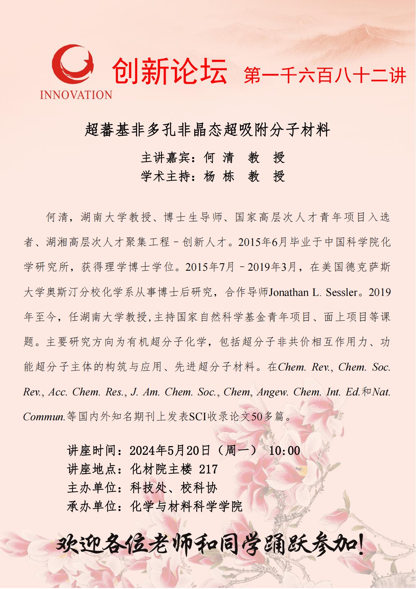 何清 教授 乐鱼网页版页面登录创新论坛第一千六百八十二讲:超蕃基非多孔非晶态超吸附分子材料 讲座时间 2024年5月20日(星期一) 10:00 讲座地点 长安校区化材院主楼 217 讲座人介绍 何清 教授 讲座内容