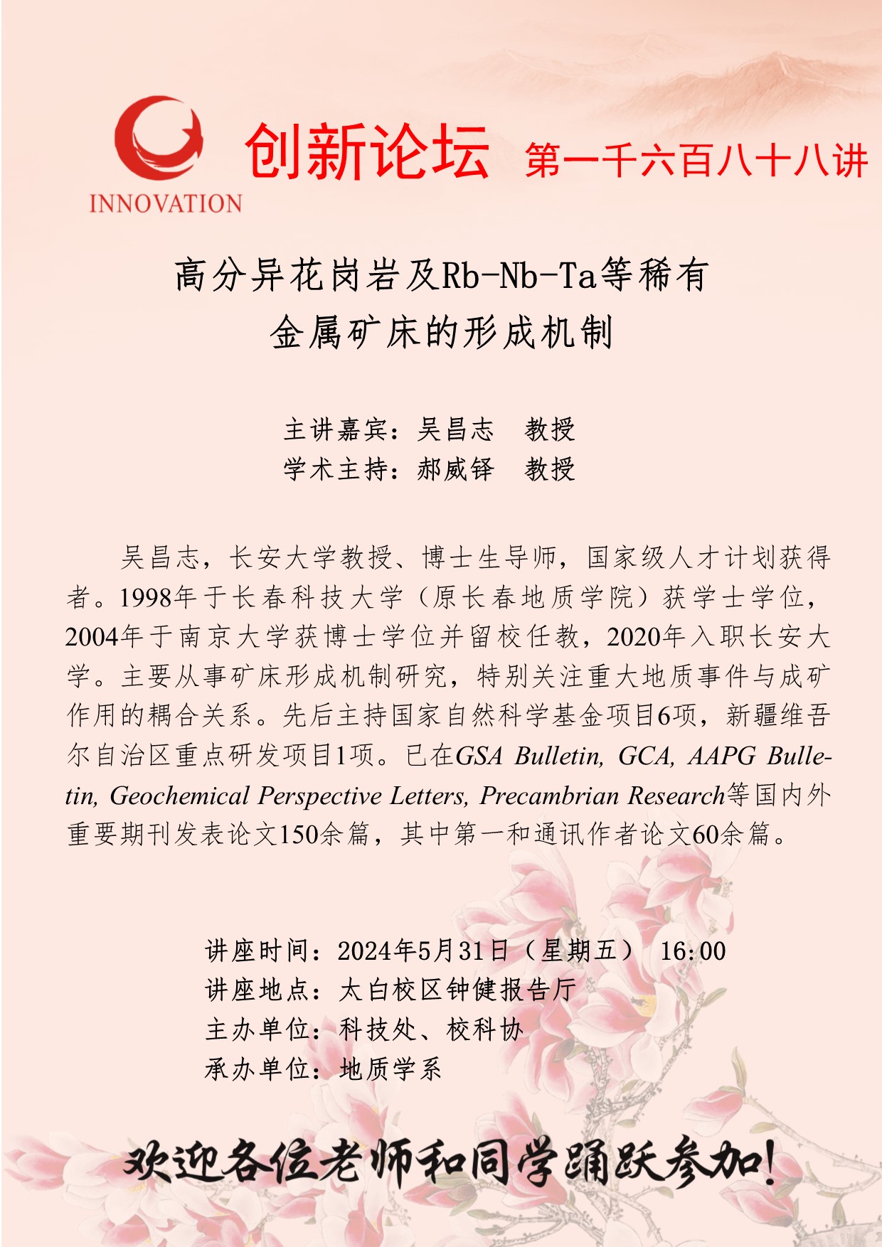 吴昌志 教授 乐鱼网页版页面登录创新论坛第一千六百八十八讲:高分异花岗岩及Rb-Nb-Ta等稀有金属矿床的形成机制 讲座时间 2024年5月31日(星期五) 16:00 讲座地点 太白校区钟健报告厅 讲座人介绍 吴昌志 教授 讲座内容