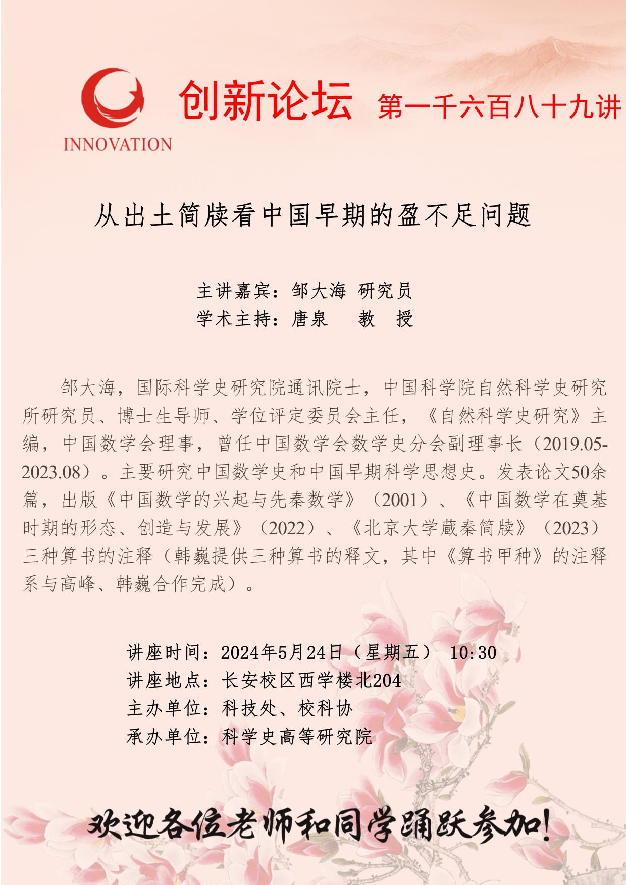 邹大海 研究员 乐鱼网页版页面登录创新论坛第一千六百八十九讲:从出土简牍看中国早期的盈不足问题 讲座时间 2024年5月24日(星期五) 10:30 讲座地点 长安校区西学楼北204 讲座人介绍 邹大海 研究员 讲座内容