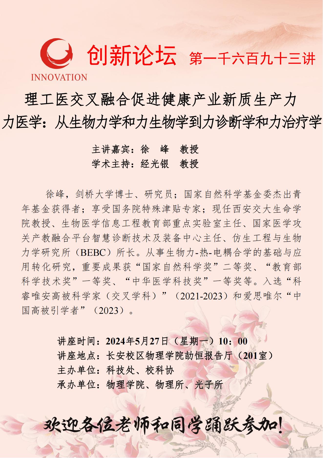 徐峰 教授 乐鱼网页版页面登录创新论坛第一千六百九十三讲:理工医交叉融合促进健康产业新质生产力——力医学:从生物力学和力生物学到力诊断学和力治疗学 讲座时间 2024年5月27日(星期一)10:00 讲座地点 长安校区物理学院劼恒报告厅(201室) 讲座人介绍 徐峰 教授 讲座内容