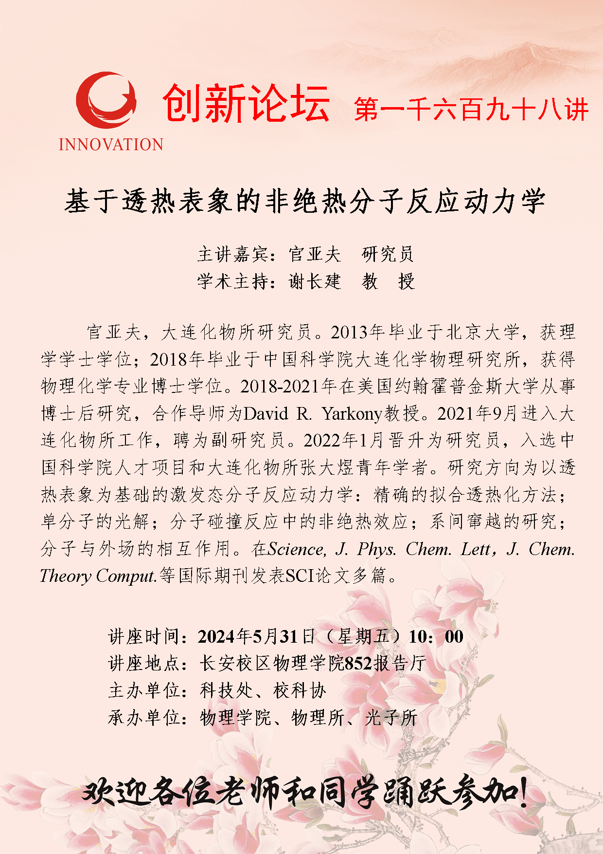 官亚夫 研究员 乐鱼网页版页面登录创新论坛第一千六百九十八讲:基于透热表象的非绝热分子反应动力学 讲座时间 2024年5月31日(星期五)10:00 讲座地点 长安校区物理学院852报告厅 讲座人介绍 官亚夫 研究员 讲座内容