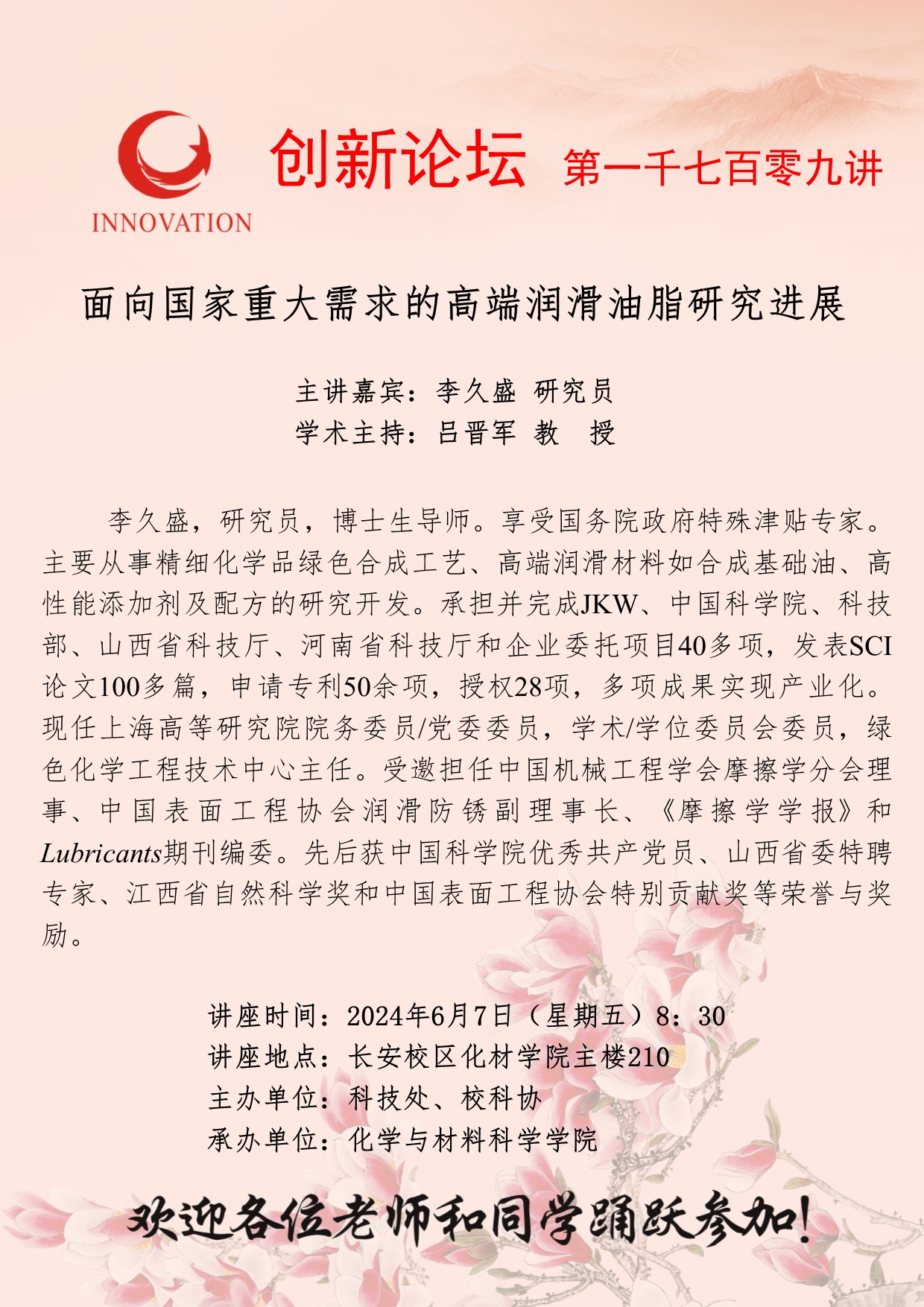 李久盛 研究员 乐鱼网页版页面登录创新论坛第一千七百零九讲:面向国家重大需求的高端润滑油脂研究进展 讲座时间 2024年6月7日(星期五)8:30 讲座地点 长安校区化材学院主楼210 讲座人介绍 李久盛 研究员 讲座内容