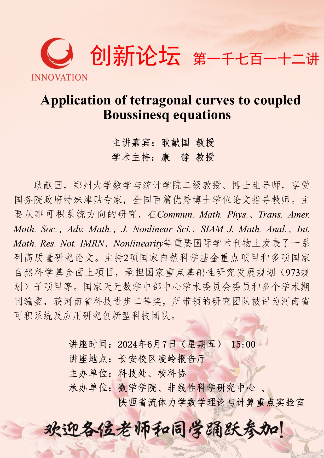 耿献国 教授 乐鱼网页版页面登录创新论坛第一千七百一十二讲:Application of tetragonal curves to coupled Boussinesq equations 讲座时间 2024年6月7日(星期五) 15:00 讲座地点 长安校区凌岭报告厅 讲座人介绍 耿献国 教授 讲座内容