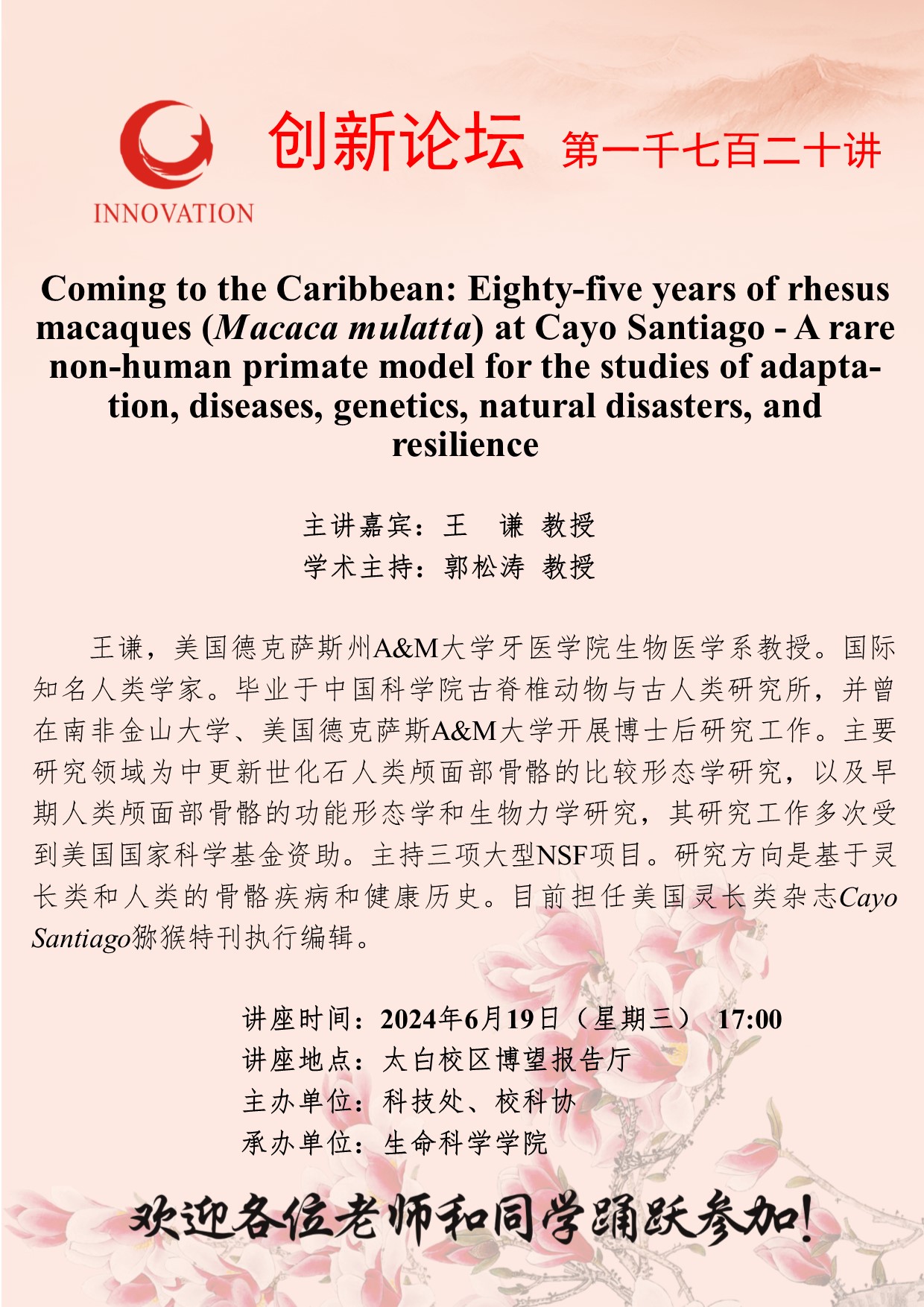 王谦 教授 乐鱼网页版页面登录创新论坛第一千七百二十讲:Coming to the Caribbean: Eighty-five years of rhesus macaques (Macaca mulatta) at Cayo Santiago - A rare non-human primate model for the studies of adaptation, diseases, genetics, natural disasters, and resilience 讲座时间 2024年6月19日(星期三) 17:00 讲座地点 太白校区博望报告厅 讲座人介绍 王谦 教授 讲座内容