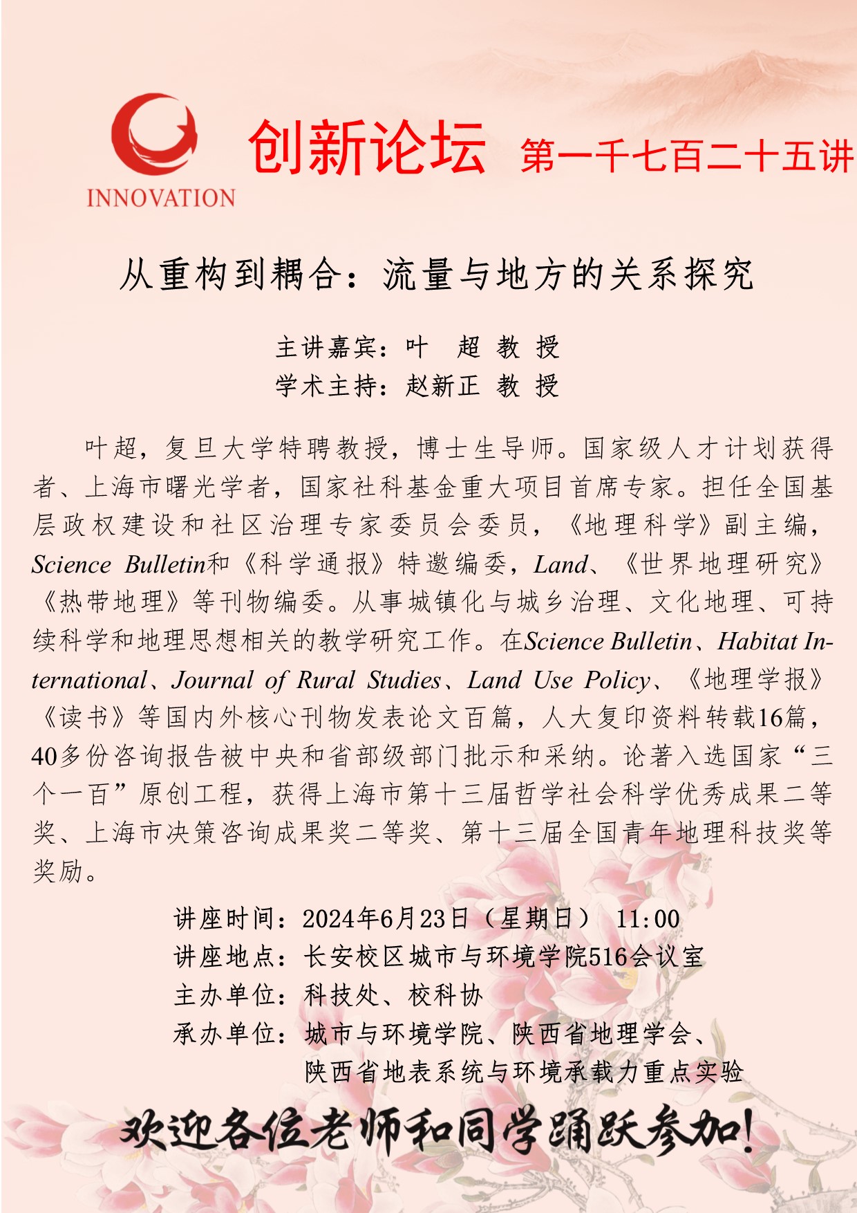 叶超 教授 乐鱼网页版页面登录创新论坛第一千七百二十五讲:从重构到耦合:流量与地方的关系探究 讲座时间 2024年6月23日(星期日) 11:00 讲座地点 长安校区城市与环境学院516会议室 讲座人介绍 叶超 教授 讲座内容