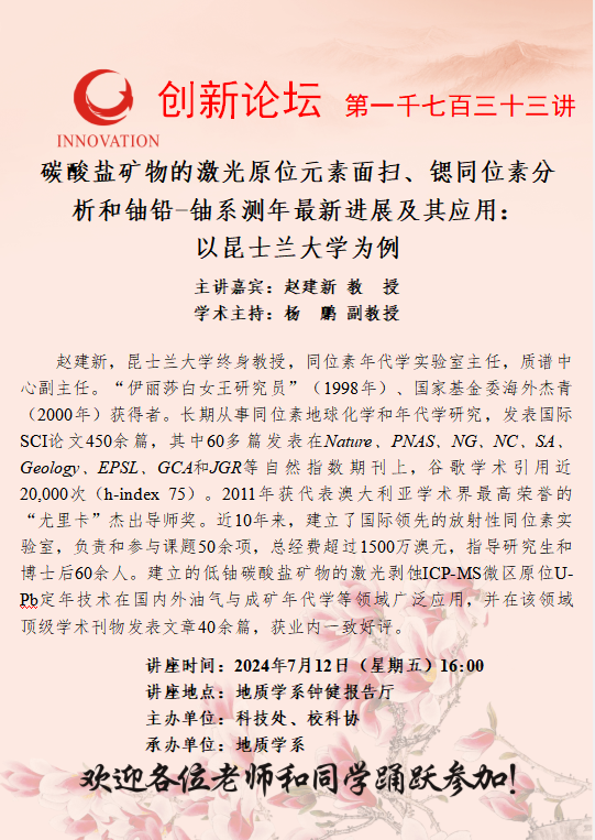 赵建新 教授 乐鱼网页版页面登录创新论坛第一千七百三十三讲:碳酸盐矿物的激光原位元素面扫、锶同位素分析和铀铅-铀系测年最新进展及其应用:以昆士兰大学为例 讲座时间 2024年7月12日(星期五)16:00 讲座地点 地质学系钟健报告厅 讲座人介绍 赵建新 教授 讲座内容