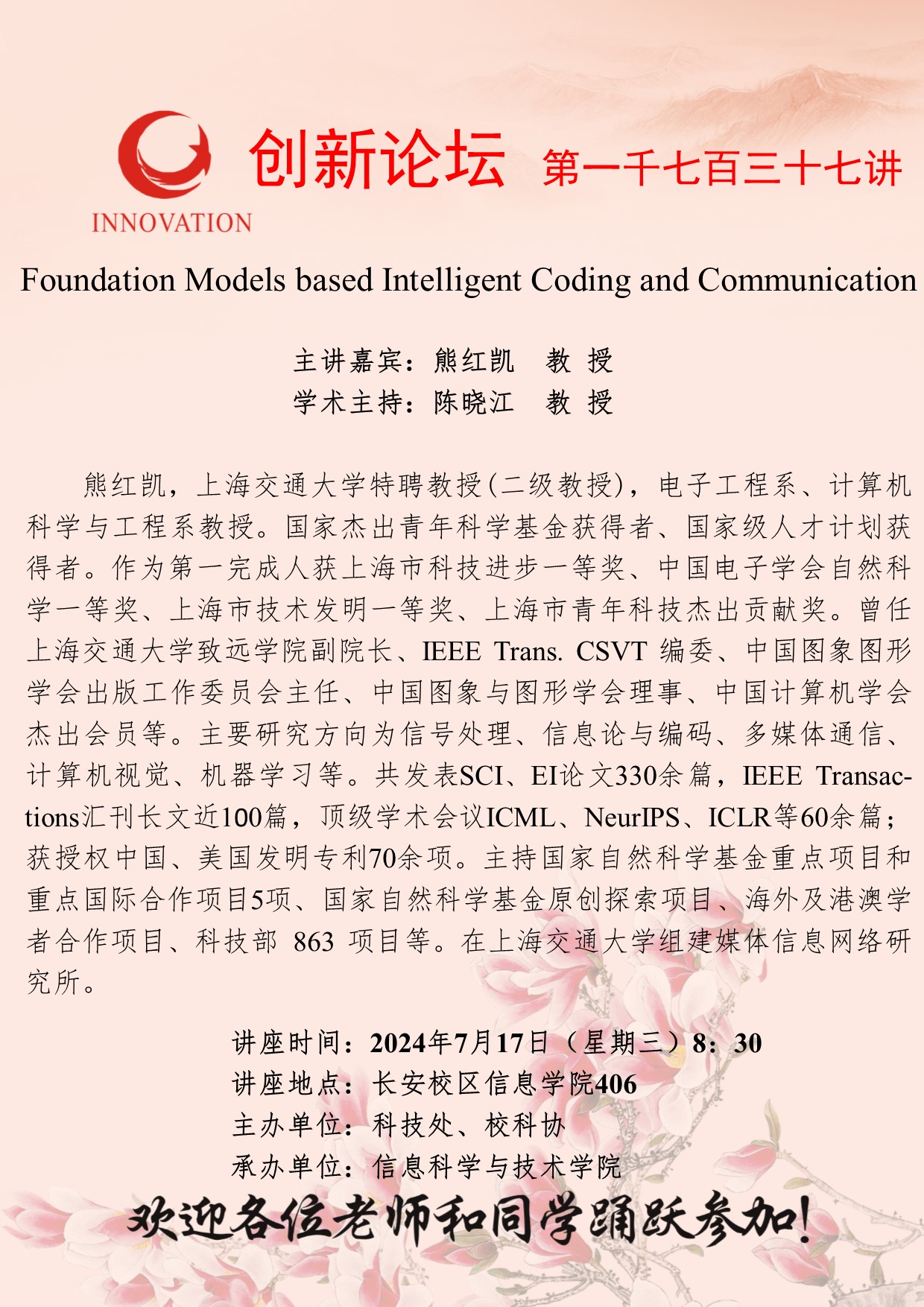 熊红凯 教授 乐鱼网页版页面登录创新论坛第一千七百三十七讲:Foundation Models based Intelligent Coding and Communication 讲座时间 2024年7月17日(星期三)8:30 讲座地点 长安校区信息学院406 讲座人介绍 熊红凯 教授 讲座内容