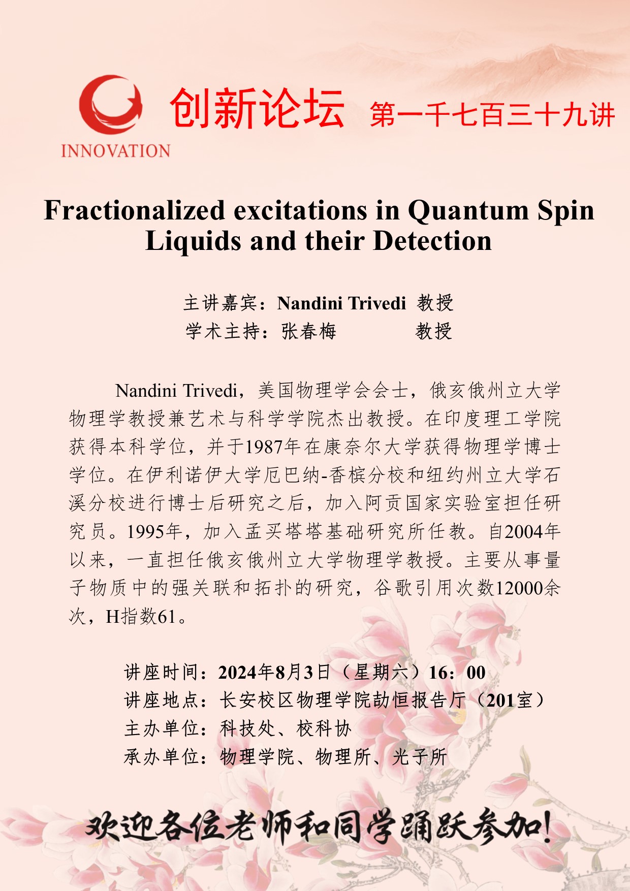 Nandini Trivedi 教授 乐鱼网页版页面登录创新论坛第一千七百三十九讲:Fractionalized excitations in Quantum Spin Liquids and their Detection 讲座时间 2024年8月3日(星期六)16:00 讲座地点 长安校区物理学院劼恒报告厅(201室) 讲座人介绍 Nandini Trivedi 教授 讲座内容