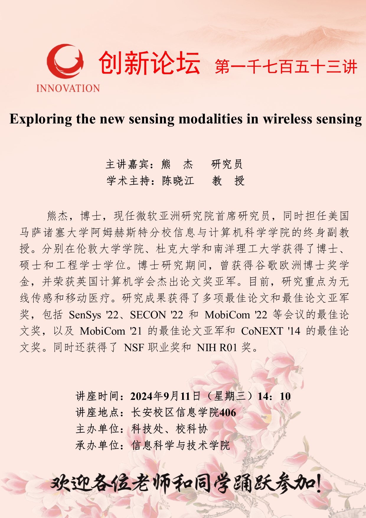 熊杰 研究员 乐鱼网页版页面登录创新论坛第一千七百五十三讲:Exploring the new sensing modalities in wireless sensing 讲座时间 2024年9月11日(星期三)14:10 讲座地点 长安校区信息学院406 讲座人介绍 熊杰 研究员 讲座内容