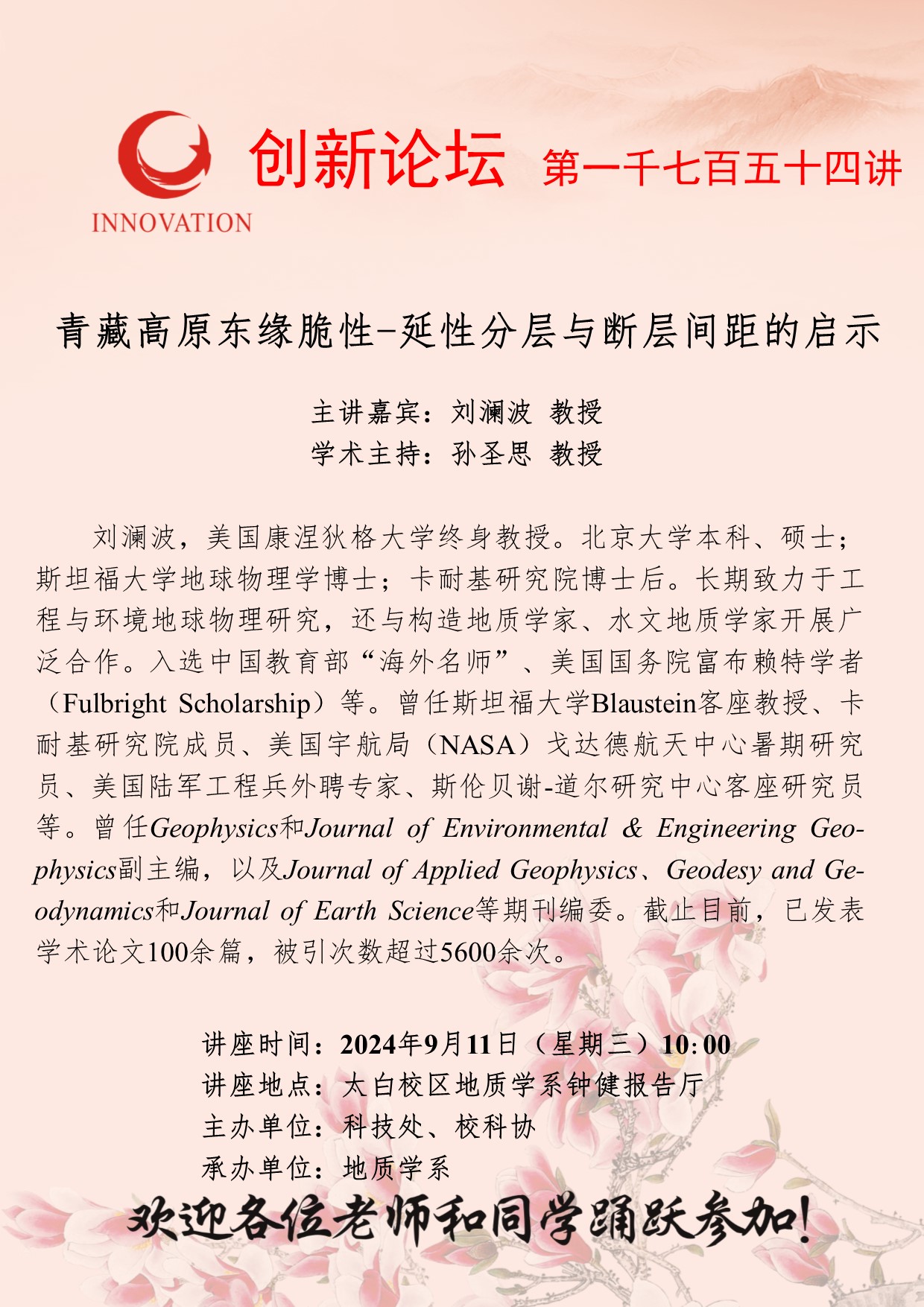 刘澜波 教授 乐鱼网页版页面登录创新论坛第一千七百五十四讲:青藏高原东缘脆性-延性分层与断层间距的启示 讲座时间 2024年9月11日(星期三)10:00 讲座地点 太白校区地质学系钟健报告厅 讲座人介绍 刘澜波 教授 讲座内容