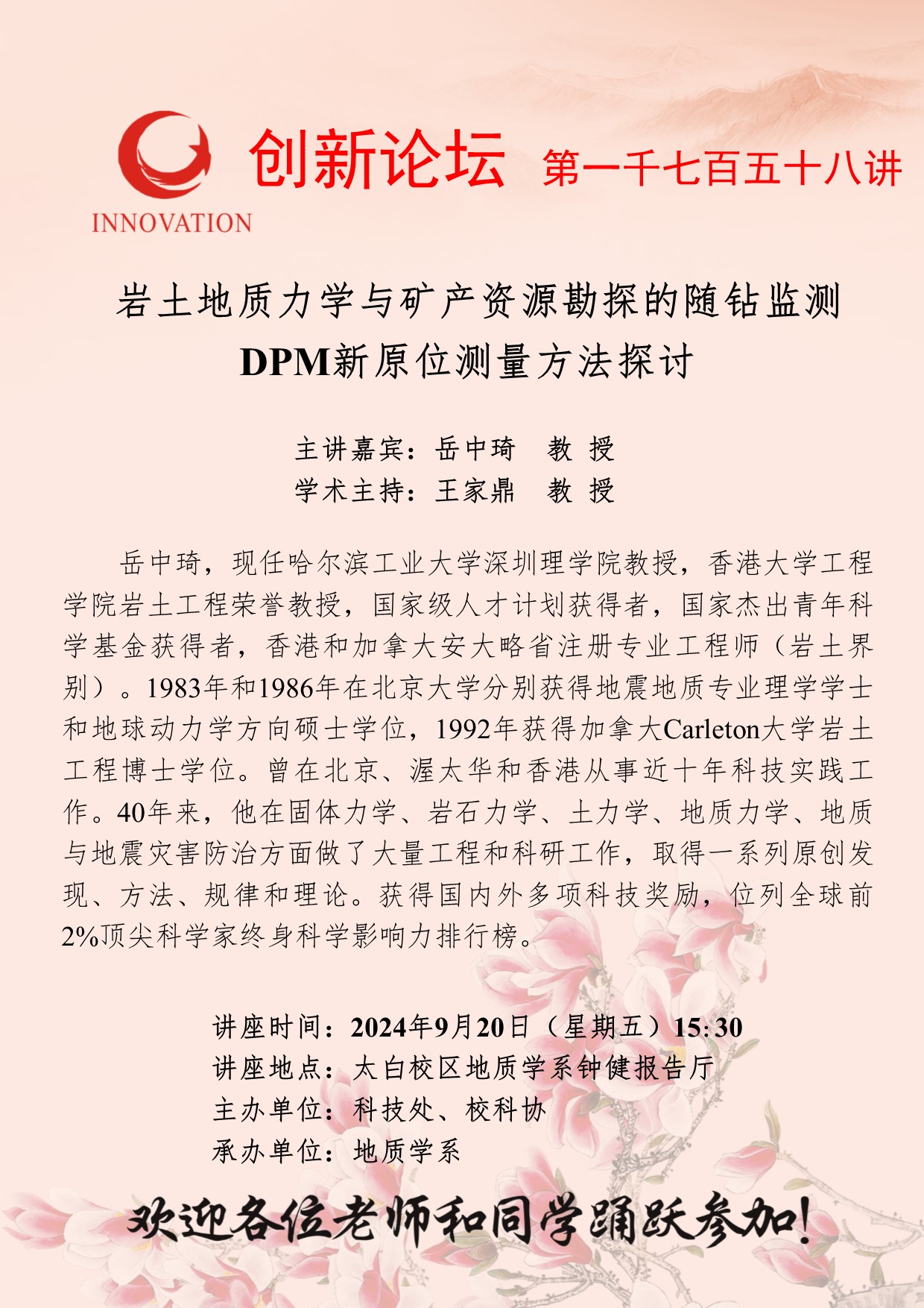 岳中琦 教授 乐鱼网页版页面登录创新论坛第一千七百五十八讲:岩土地质力学与矿产资源勘探的随钻监测 DPM新原位测量方法探讨 讲座时间 2024年9月20日(星期五) 15:30 讲座地点 太白校区地质学系钟健报告厅 讲座人介绍 岳中琦 教授 讲座内容