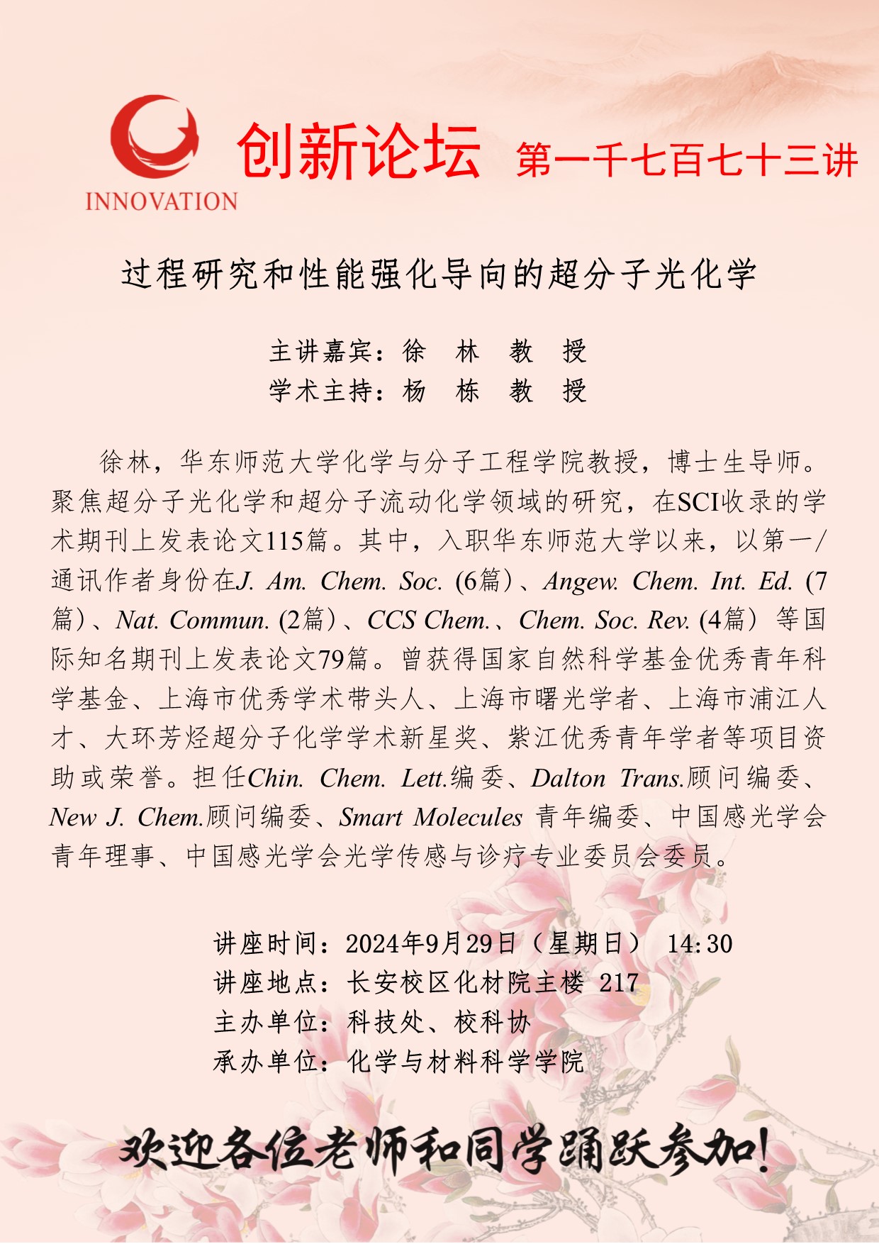 徐林 教授 乐鱼网页版页面登录创新论坛第一千七百七十三讲:过程研究和性能强化导向的超分子光化学 讲座时间 2024年9月29日(星期日) 14:30 讲座地点 长安校区化材院主楼 217 讲座人介绍 徐林 教授 讲座内容