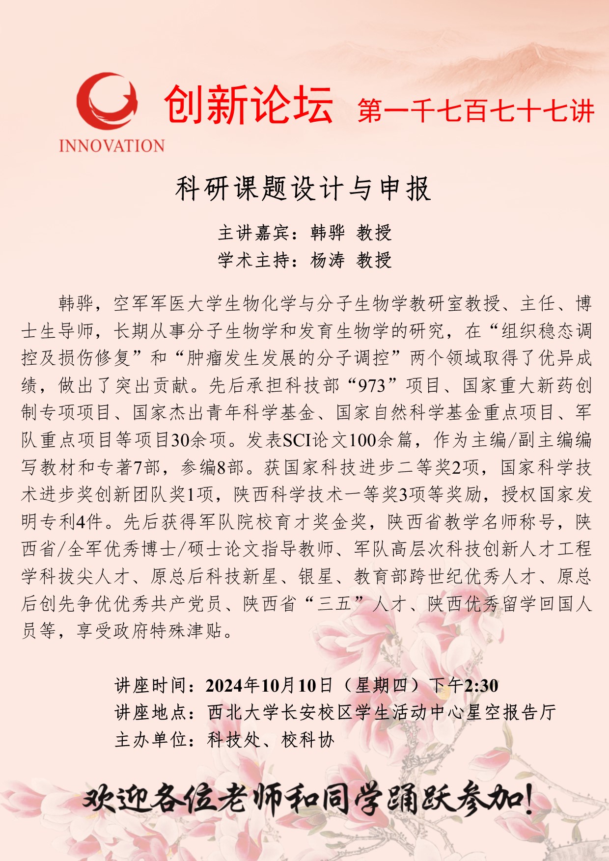 韩骅 教授 乐鱼网页版页面登录创新论坛第一千七百七十七讲:科研课题设计与申报 讲座时间 2024年10月10日(星期四)下午2:30 讲座地点 乐鱼网页版页面登录长安校区学生活动中心星空报告厅 讲座人介绍 韩骅 教授 讲座内容