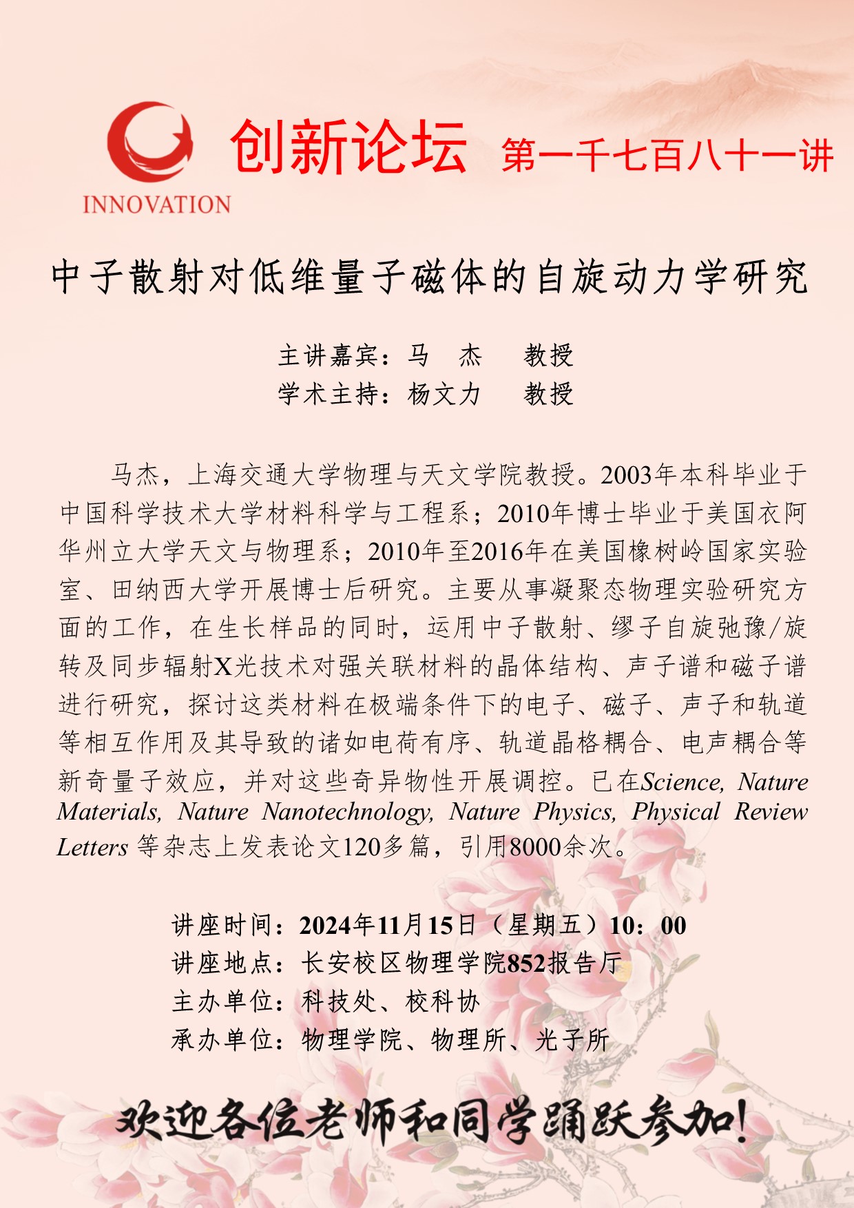 马杰 教授 乐鱼网页版页面登录创新论坛第一千七百八十一讲:中子散射对低维量子磁体的自旋动力学研究 讲座时间 2024年11月15日(星期五)10:00 讲座地点 长安校区物理学院852报告厅 讲座人介绍 马杰 教授 讲座内容