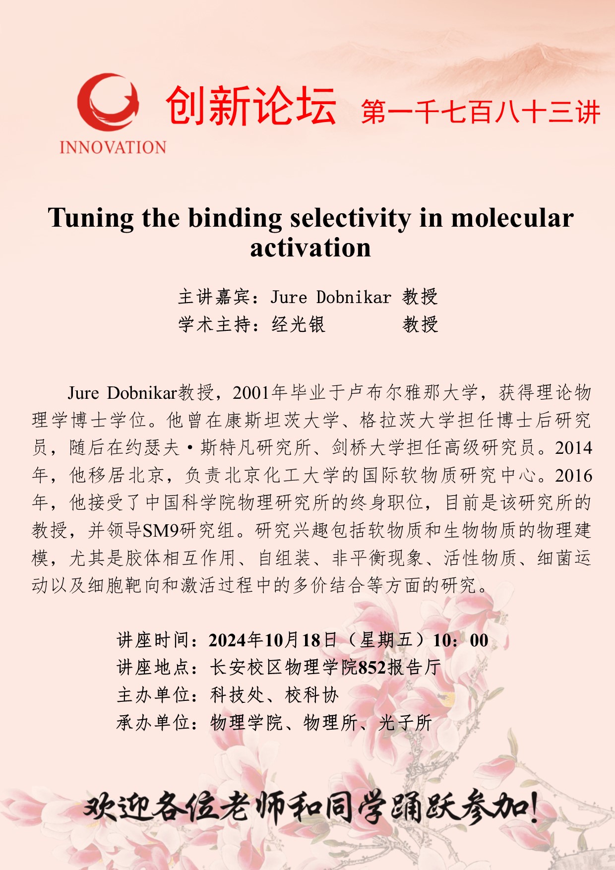 Jure Dobnikar 教授 乐鱼网页版页面登录创新论坛第一千七百八十三讲:Tuning the binding selectivity in molecular activation 讲座时间 2024年10月18日(星期五)10:00 讲座地点 长安校区物理学院852报告厅 讲座人介绍 Jure Dobnikar 教授 讲座内容