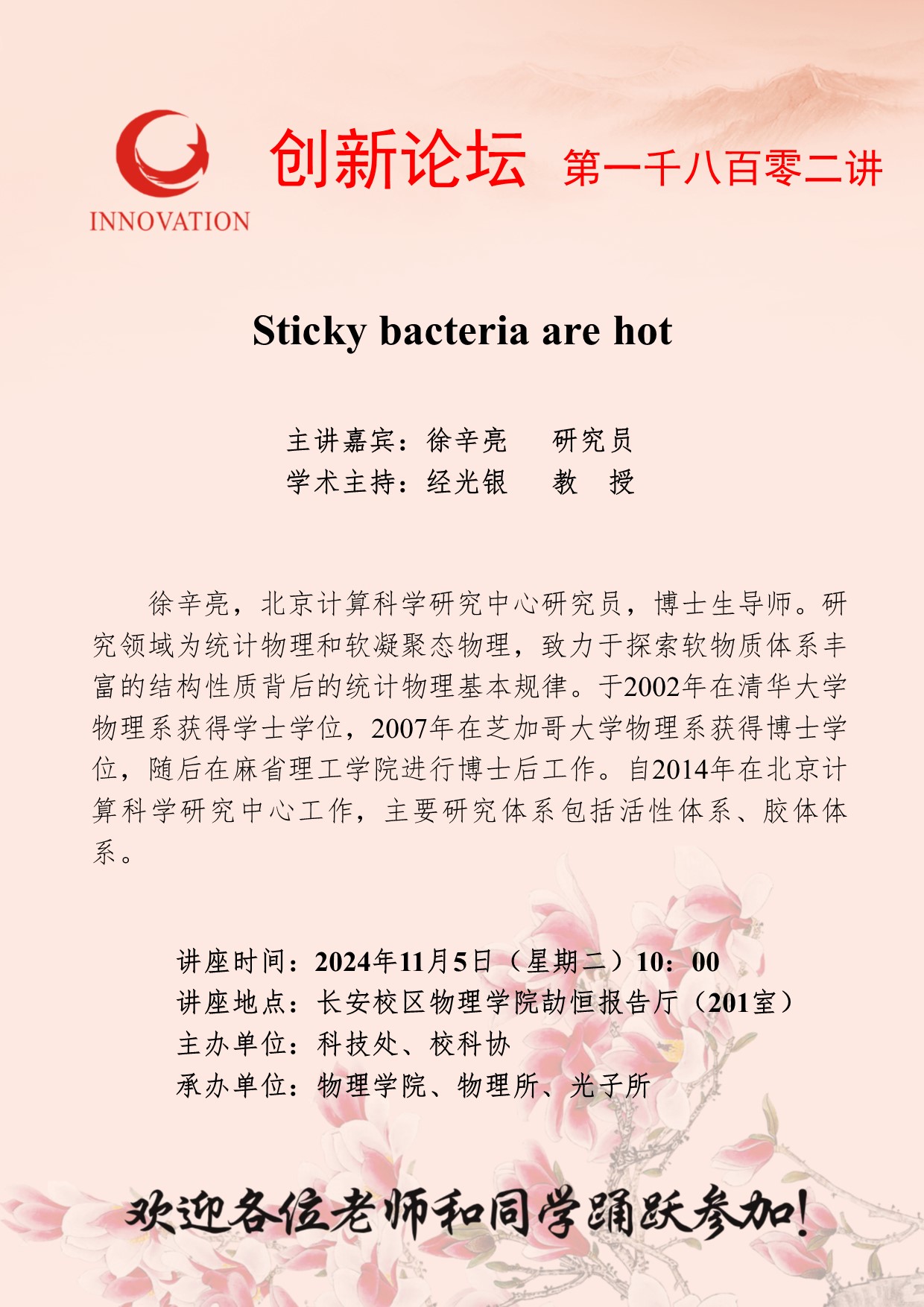 徐辛亮 研究员 乐鱼网页版页面登录创新论坛第一千八百零二讲:Sticky bacteria are hot 讲座时间 2024年11月5日(星期二)10:00 讲座地点 长安校区物理学院劼恒报告厅(201室) 讲座人介绍 徐辛亮 研究员 讲座内容