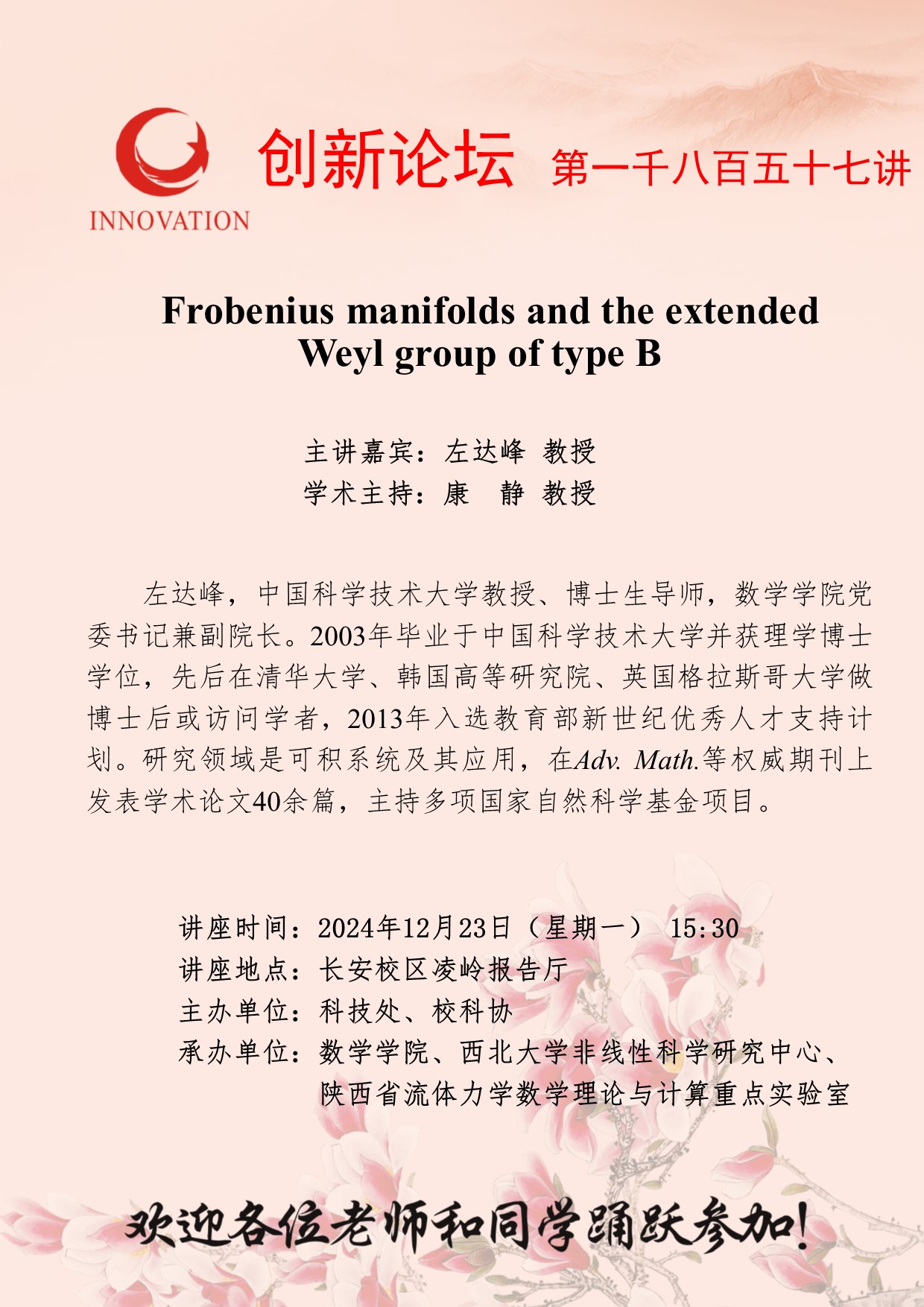 左达峰 教授 乐鱼网页版页面登录创新论坛第一千八百五十七讲:Frobenius manifolds and the extended Weyl group of type B 讲座时间 2024年12月23日(星期一) 15:30 讲座地点 长安校区凌岭报告厅 讲座人介绍 左达峰 教授 讲座内容