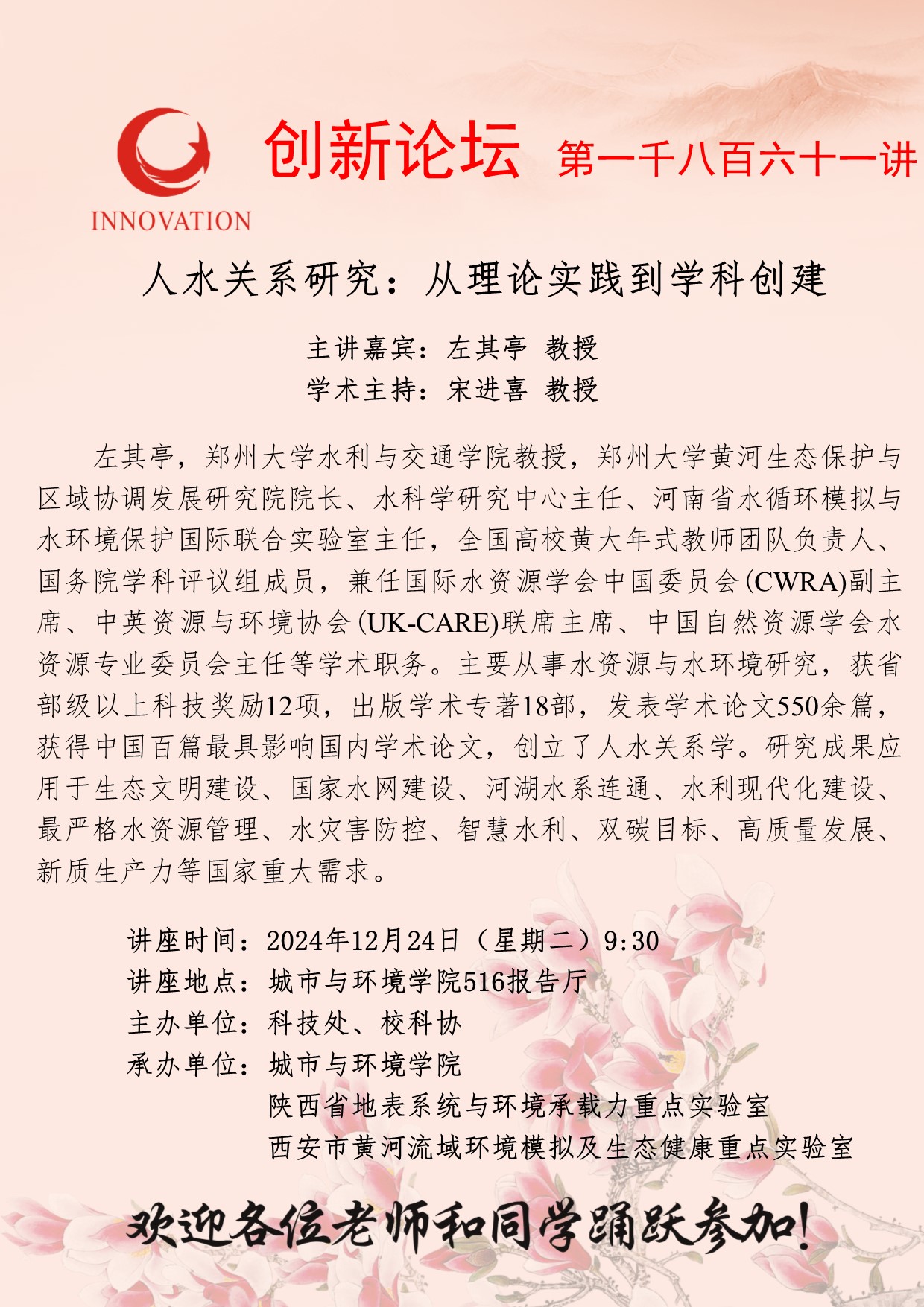 左其亭 教授 乐鱼网页版页面登录创新论坛第一千八百六十一讲:人水关系研究:从理论实践到学科创建 讲座时间 2024年12月24日(星期二)9:30 讲座地点 城市与环境学院516报告厅 讲座人介绍 左其亭 教授 讲座内容