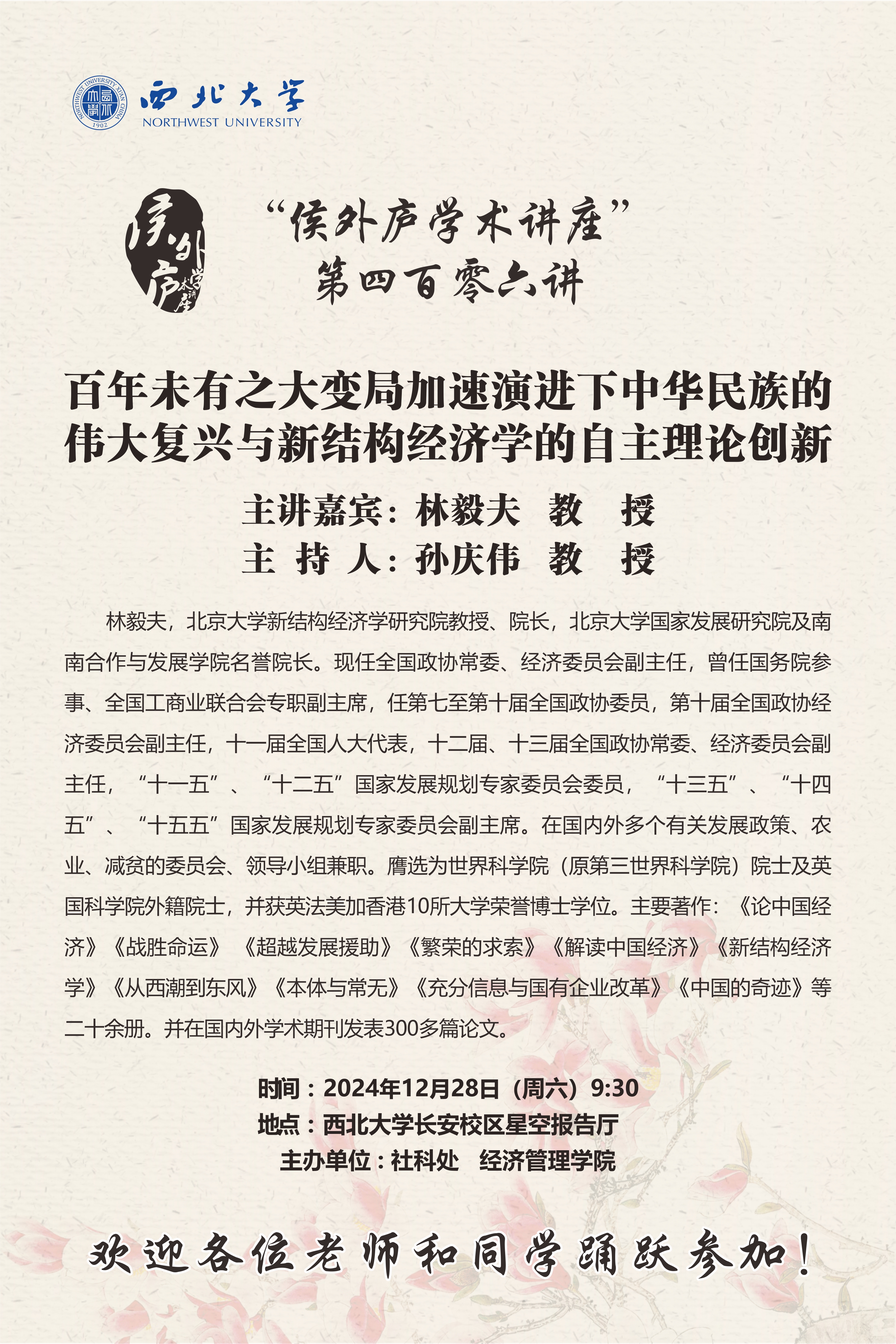 林毅夫 教授 “侯外庐学术讲座”第四百零六讲:百年未有之大变局加速演进下中华民族的伟大复兴与新结构经济学的自主理论创新 讲座时间 2024年12月28日(周六)9:30 讲座地点 乐鱼网页版页面登录长安校区星空报告厅 讲座人介绍 林毅夫 教授 讲座内容