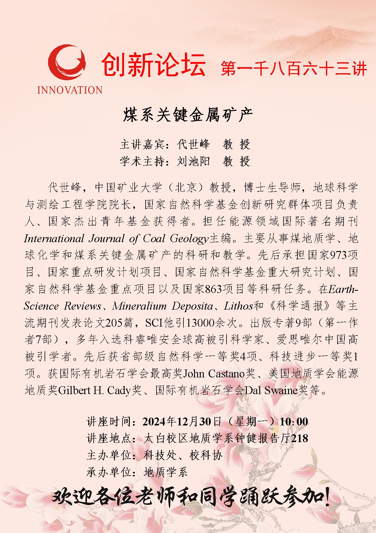 代世峰 教授 乐鱼网页版页面登录创新论坛第一千八百六十三讲:煤系关键金属矿产 讲座时间 2024年12月30日(星期一)10:00 讲座地点 太白校区地质学系钟健报告厅218 讲座人介绍 代世峰 教授 讲座内容