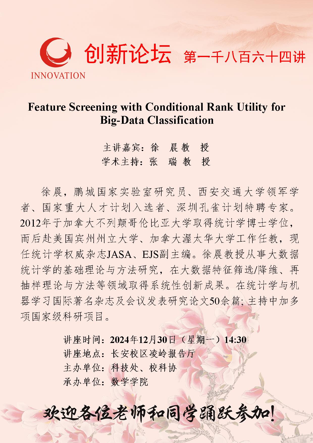 徐晨 教授 乐鱼网页版页面登录创新论坛第一千八百六十四讲:Feature Screening with Conditional Rank Utility for Big-Data Classification 讲座时间 2024年12月30日(星期一)14:30 讲座地点 长安校区凌岭报告厅 讲座人介绍 徐晨 教授 讲座内容