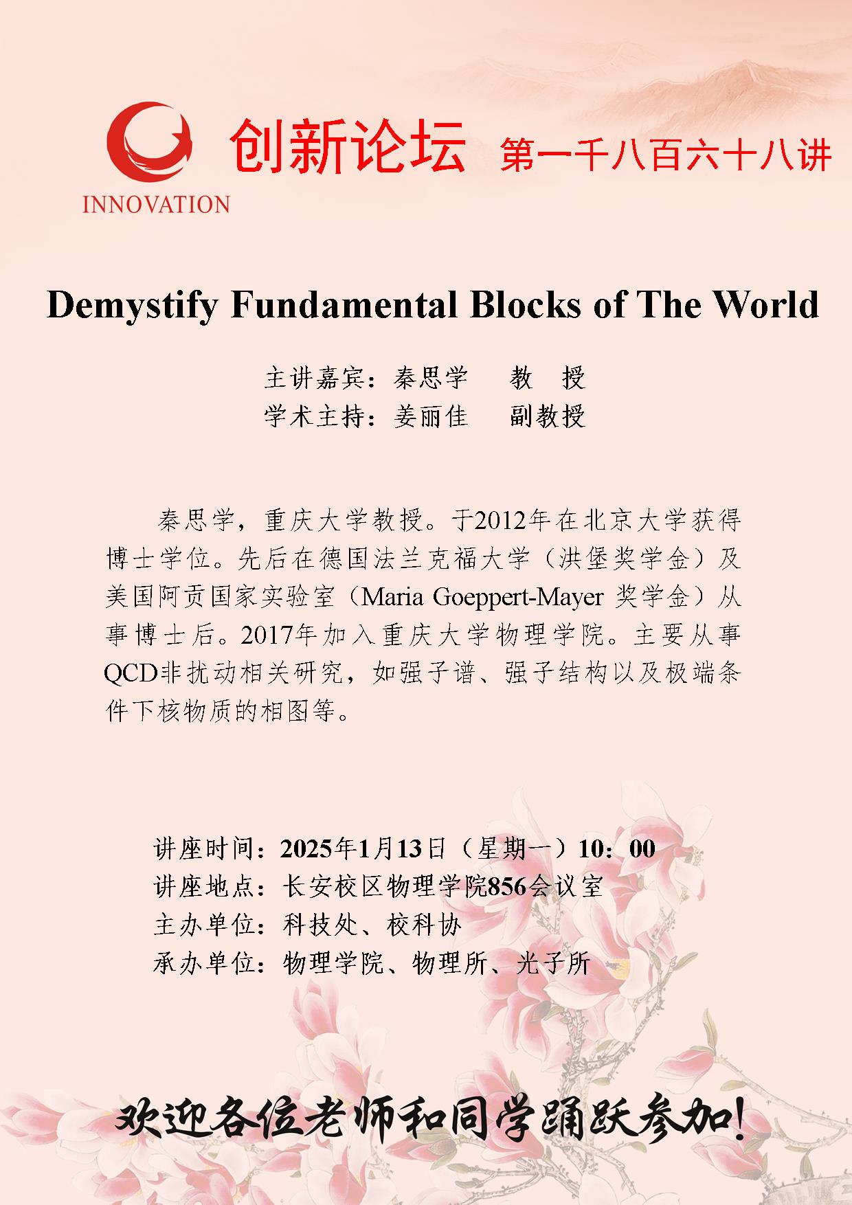 秦思学 教授 乐鱼网页版页面登录创新论坛第一千八百六十八讲:Demystify Fundamental Blocks of The World 讲座时间 2025年1月13日(星期一)10:00 讲座地点 长安校区物理学院856会议室 讲座人介绍 秦思学 教授 讲座内容