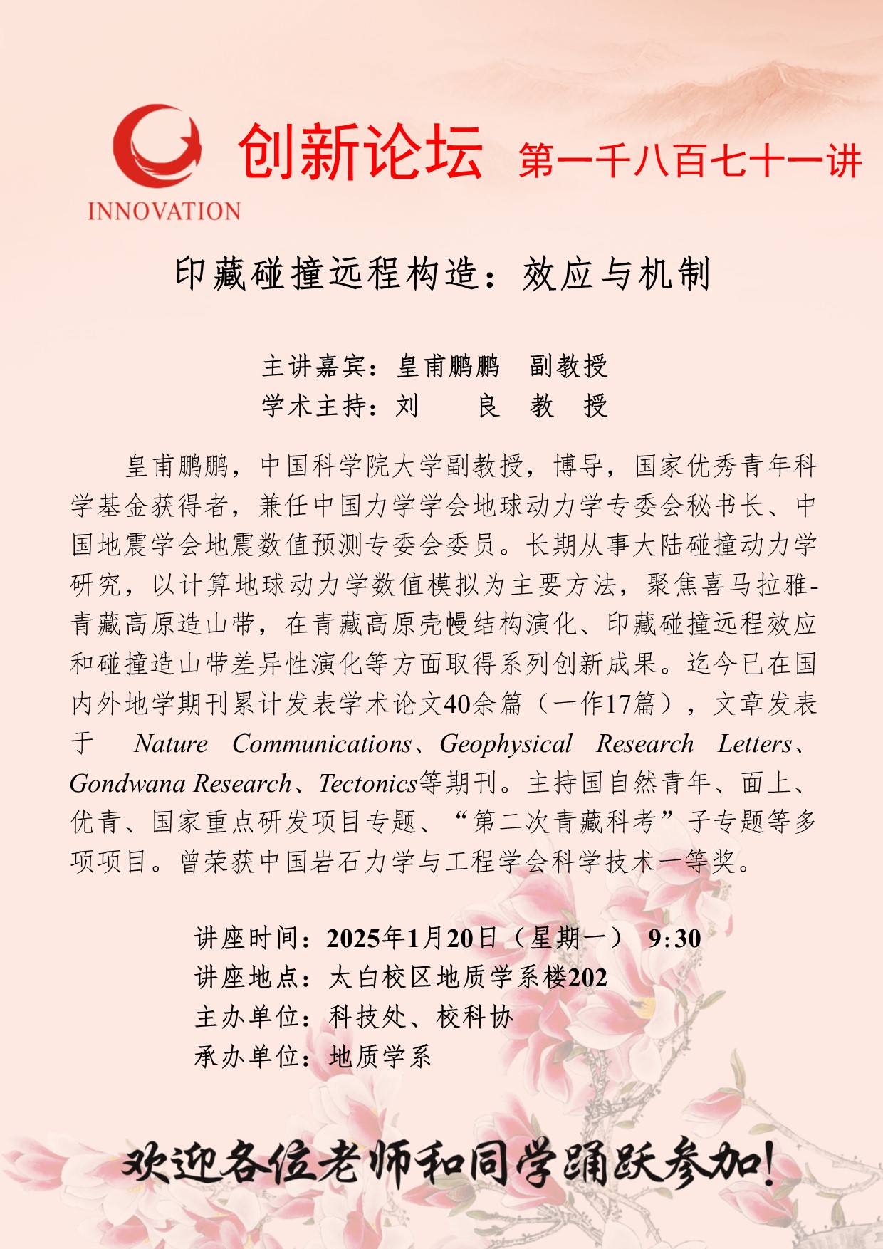 皇甫鹏鹏 副教授 乐鱼网页版页面登录创新论坛第一千八百七十一讲:印藏碰撞远程构造:效应与机制 讲座时间 2025年1月20日(星期一) 9:30 讲座地点 太白校区地质学系楼202 讲座人介绍 皇甫鹏鹏 副教授 讲座内容