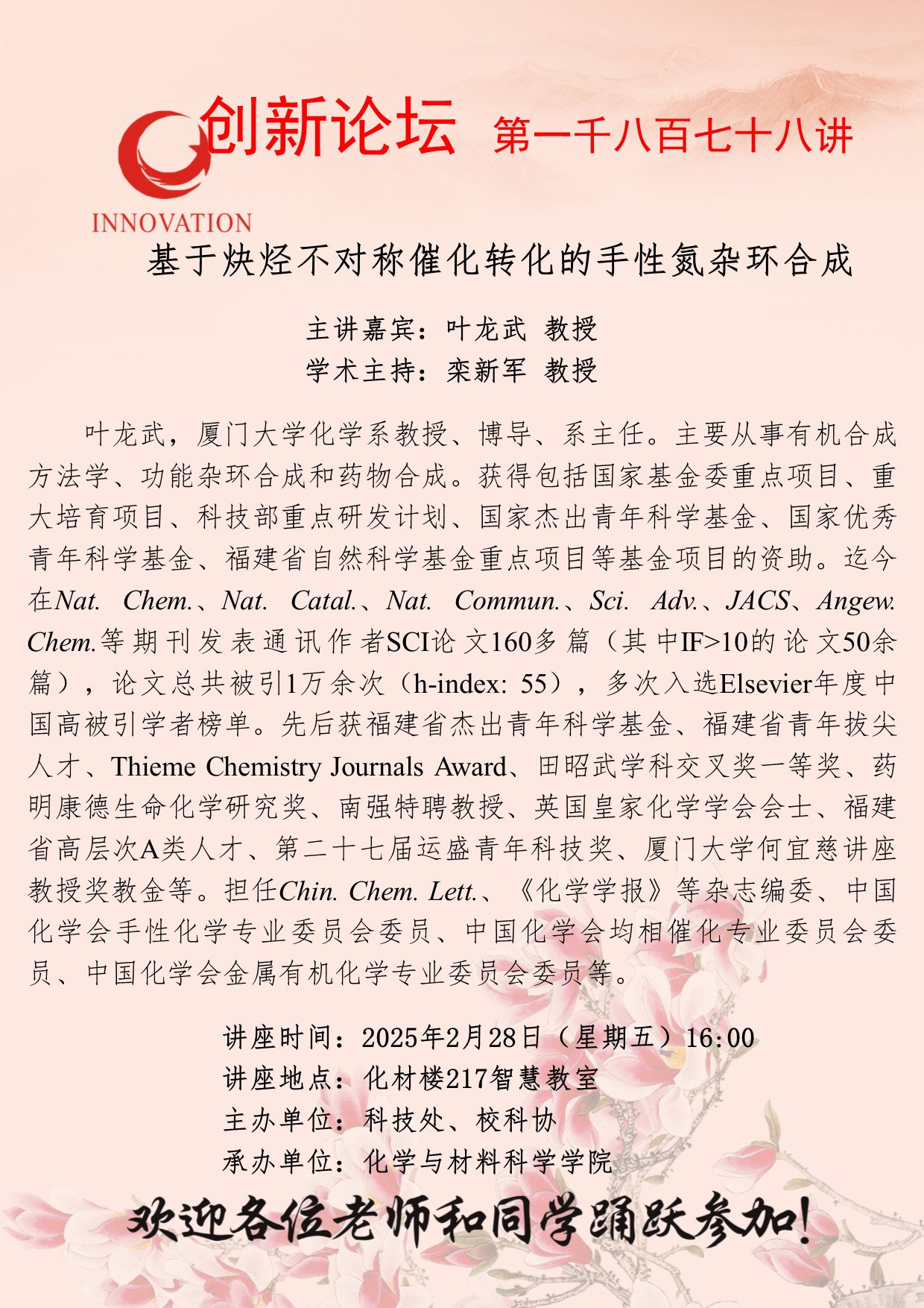 叶龙武 教授 乐鱼网页版页面登录创新论坛第一千八百七十八讲:基于炔烃不对称催化转化的手性氮杂环合成 讲座时间 2025年2月28日(星期五)16:00 讲座地点 化材楼217智慧教室 讲座人介绍 叶龙武 教授 讲座内容