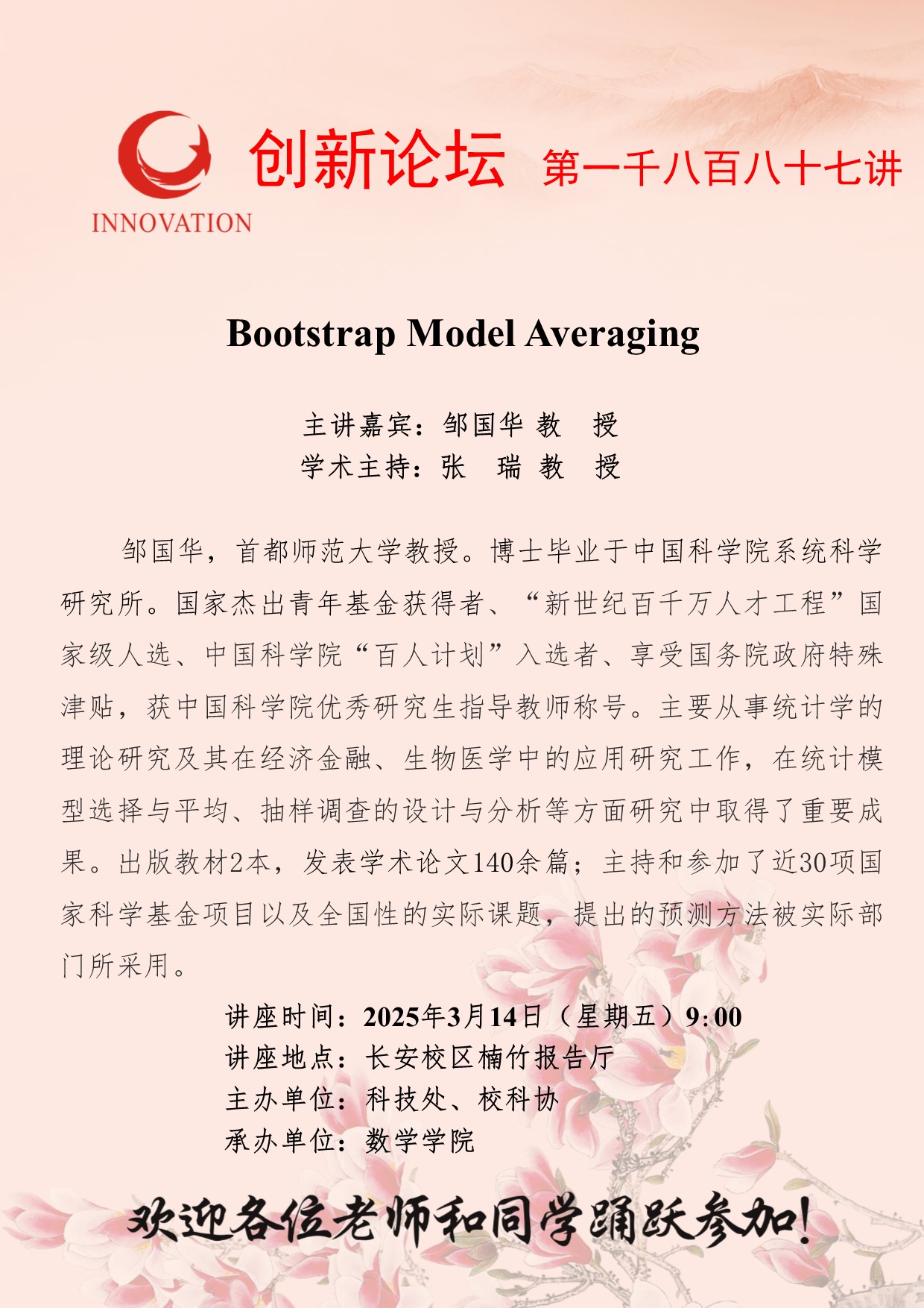 邹国华 教授 乐鱼网页版页面登录创新论坛第一千八百八十七讲:Bootstrap Model Averaging 讲座时间 2025年3月14日(星期五)9:00 讲座地点 长安校区楠竹报告厅 讲座人介绍 邹国华 教授 讲座内容