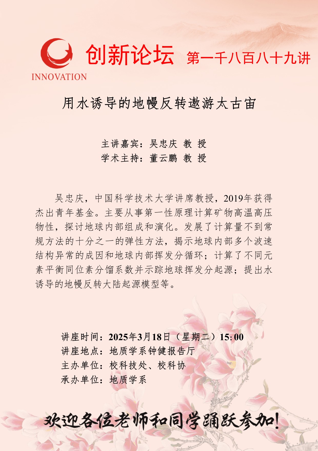 吴忠庆 教授 乐鱼网页版页面登录创新论坛第一千八百八十九讲:用水诱导的地幔反转遨游太古宙 讲座时间 2025年3月18日(星期二)15:00 讲座地点 地质学系钟健报告厅 讲座人介绍 吴忠庆 教授 讲座内容